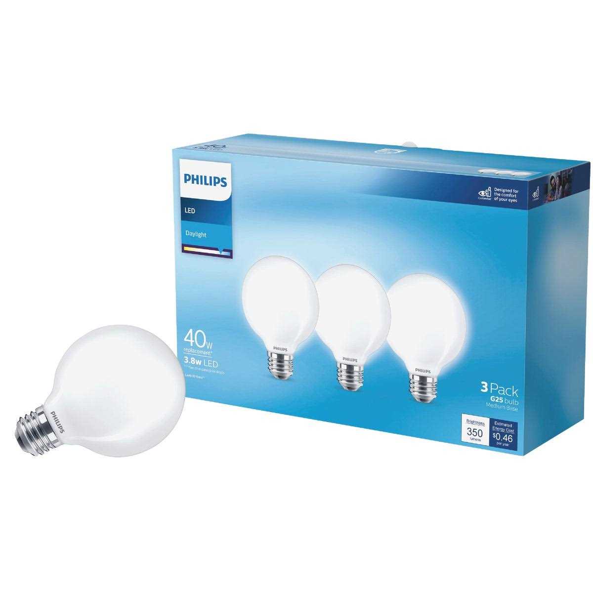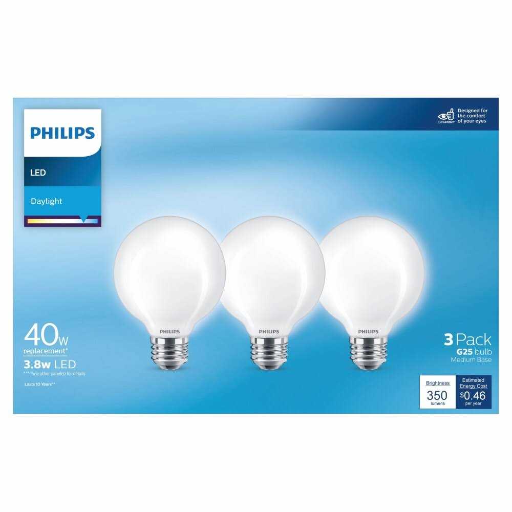 Philips G25 globe LED all-purpose light bulbs provide 350 lumens of cool, full-spectrum light, equivalent to 40-watt incandescent. At 5000-Kelvin, these bright white bulbs offer bright yet warm lighting with exceptional clarity and high CRI (color rendering index) ideal for project and task lighting and to brighten larger spaces. Best-in-class Philips LEDs provide turn on instantly with energy-efficient flicker-free, natural light that won’t degrade over time. Unlike cheaper imitations, Philips LED offers clean, natural lighting with exceptional clarity. LED light bulbs last up to 10x longer than incandescent and halogen bulbs. Unlike fluorescent and compact fluorescent bulbs, Philips LEDs are mercury-free so they don’t contribute to hazardous waste. Philips G25 globe light bulb is expected to deliver a lifetime of up to 15,000 hours and over 10 years (based on three hours per day), saving you the cost and hassle of frequent bulb replacement.