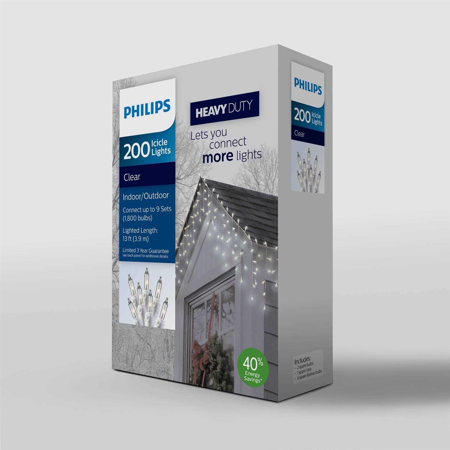 Make your outdoor decorating a snap with these Philips Heavy Duty 200CT Icicle Lights in clear color with white wire. Made with industrial grade 20 gauge wire, these icicle lights are specifically designed for outdoor use. Icicle Lights have a lighted length of 13′ and a total of 9 sets can be connected end to end for a total of 1,800 bulbs, twice as many as regular light strings. Bulbs are twist resistant and have lamplock for added security.