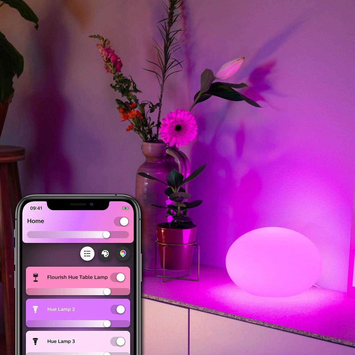 Get powerful, diffused light for any occasion with the Flourish table lamp, which offers warm light for relaxing, cool light for focusing, and colorful light to create the perfect ambiance. Control instantly via Bluetooth in a single room or pair with a Hue Bridge (sold separately) to unlock the full suite of smart lighting features in your whole home.