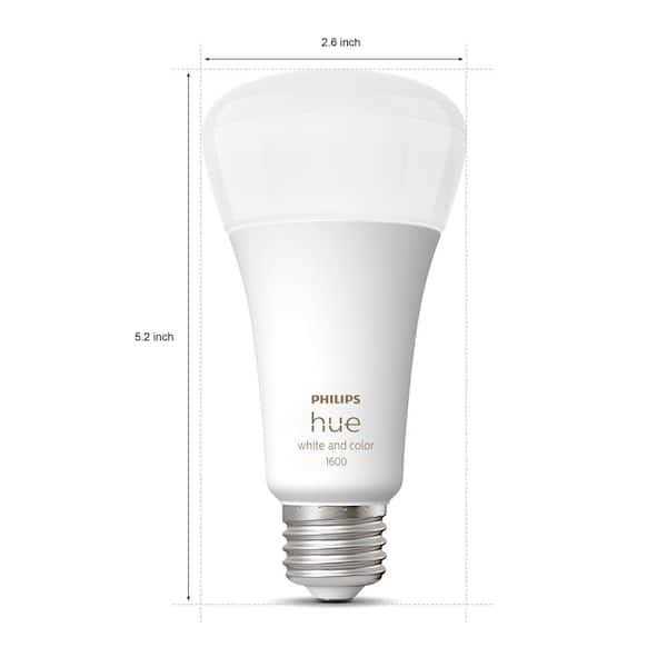 Instantly set the mood for any occasion with 16 million colors of light with Philips Hue Color Ambiance 100W A21 Color Ambiance bulb. Transform any room for an immersive entertainment experience, create the perfect atmoshpere for a get-together with friends, or complement your home decor. Give your largest spaces bright, colorful smart light with this E26 smart bulb. With a brightness equivalent to a traditional 100 W bulb, this bulb can fill living rooms, kitchens, and more with color.