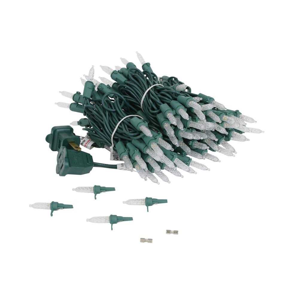 A set of LED lights costs only a fraction to run compared to other lighting – saving you money in electric bills. You are able to connect up to 30 LED sets. 100 warm white LED bulbs Cool to the touch when lit Green wire 24.75 feet lighted length 25.58 feet total length Indoor/Outdoor