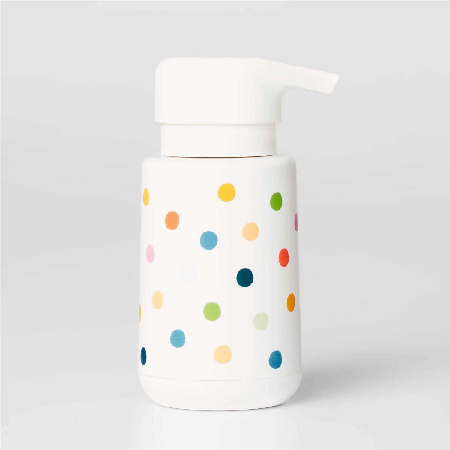 Update their bathroom decor with the Dot Soap Dispenser from Pillowfort . Featuring a cylindrical silhouette, this kids soap dispenser features an easy-to-use push dispenser to ensure they get the right amount of soap onto their palms. Showcasing allover colorful dots on a white background, this decorative soap dispenser adds fun flair to their bath decor.