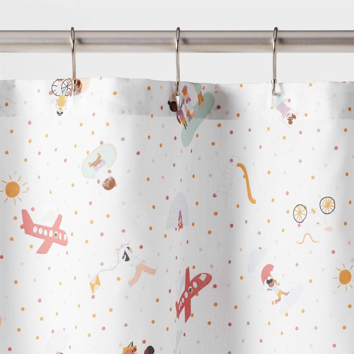 Channel fun vibes into your family’s bathroom with this Airplane Shower Curtain from Pillowfort . The twill shower curtain is decorated with a cute print of airplanes, people outside in the sun and more on a white backdrop with colorful polka dots to enclose a bathtub or shower stall for added privacy with a touch of whimsy. Made from a recycled polyester-cotton blend, the decorative shower curtain features a buttonhole top for easy installation, and is machine washable for a quick refresh whenever needed.