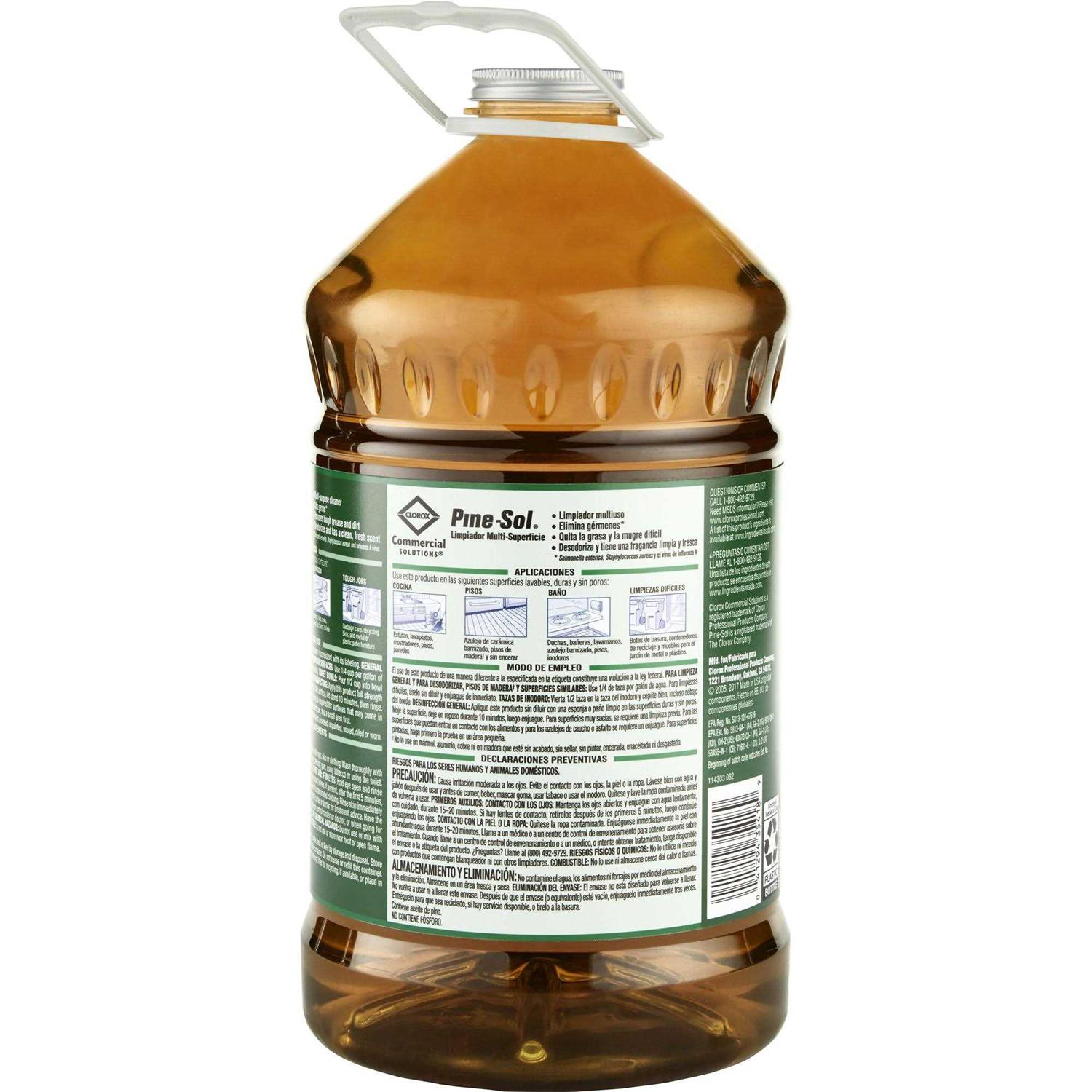 Pine-Sol Multi-Surface Cleaner cleans, deodorizes and disinfects with a distinctive, clean pine scent. It cuts through tough grease and grime fast without leaving a sticky residue. Instead of masking odors, Pine-Sol Multi-Purpose Cleaner wipes out odor-causing bacteria. It is an EPA-registered disinfectant that kills germs and bacteria that can cause illness. Use Pine-Sol Multi-Surface Cleaner on a wide variety of tough jobs and surfaces including floors, counters and sinks. From Clorox Commercial Solutions, the large size bottle is perfect for use in offices, daycare centers, restaurants, schools and other commercial facilities.