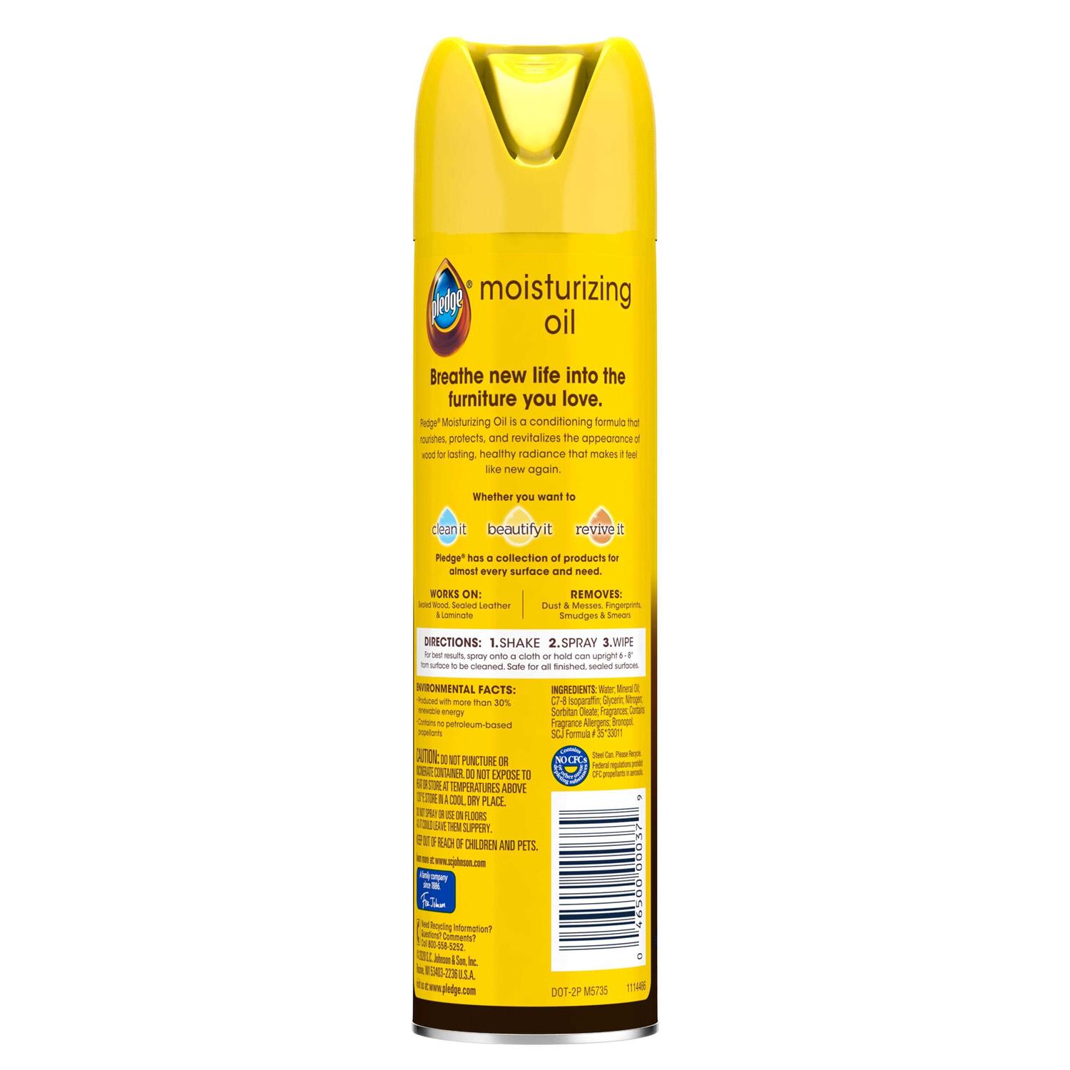 Clean your wood surfaces with extra care and give them a healthy radiance with Pledge 9.7 oz Revive Moisturizing Oil. It’s not just a furniture polish – it’s a wood-cleaning product that has conditioning agents to nourish the appearance of wood and enhance its natural beauty. Use Pledge Extra Moisturizing Furniture Spray to clean wood kitchen cabinets, windowsills, decorative trim, tables, chairs and more*. Your wood will be left with a vibrant glow!