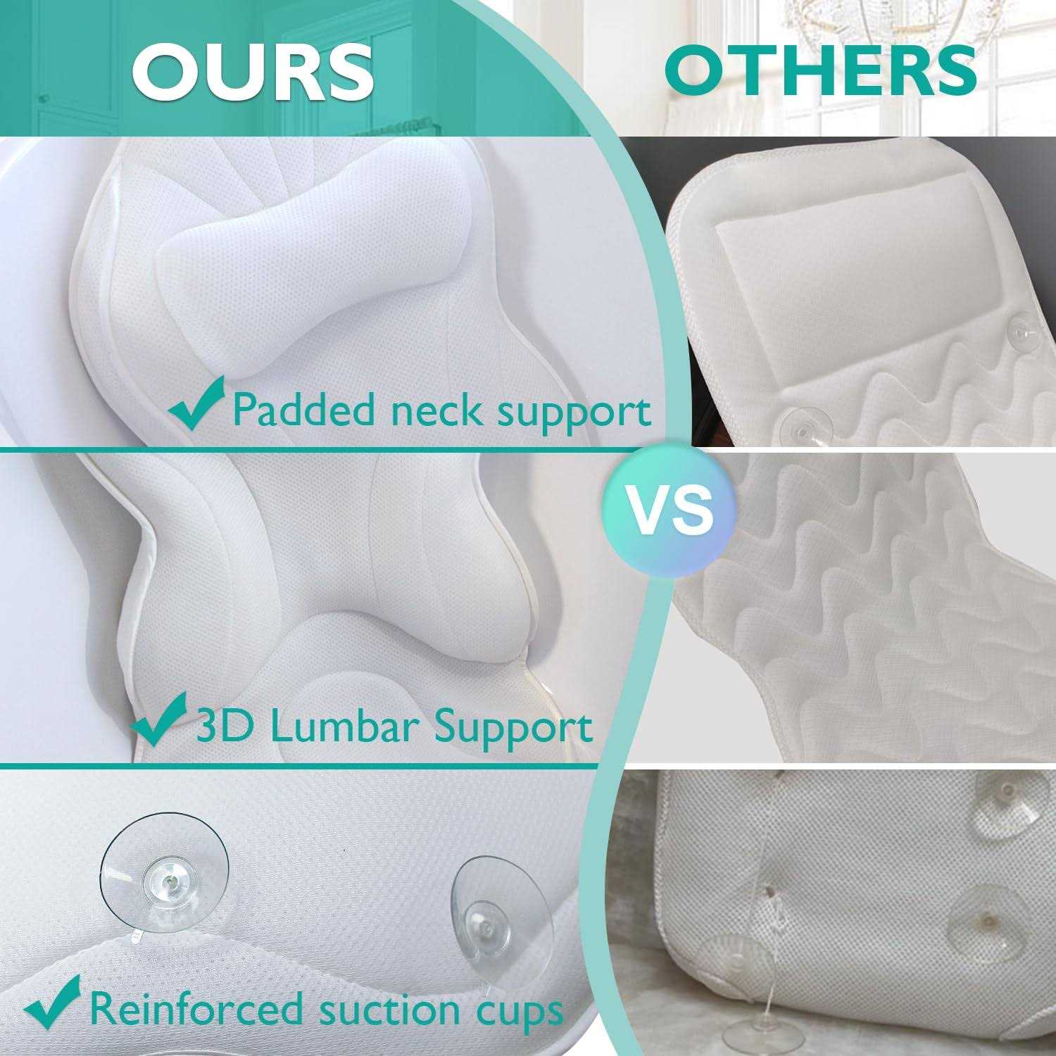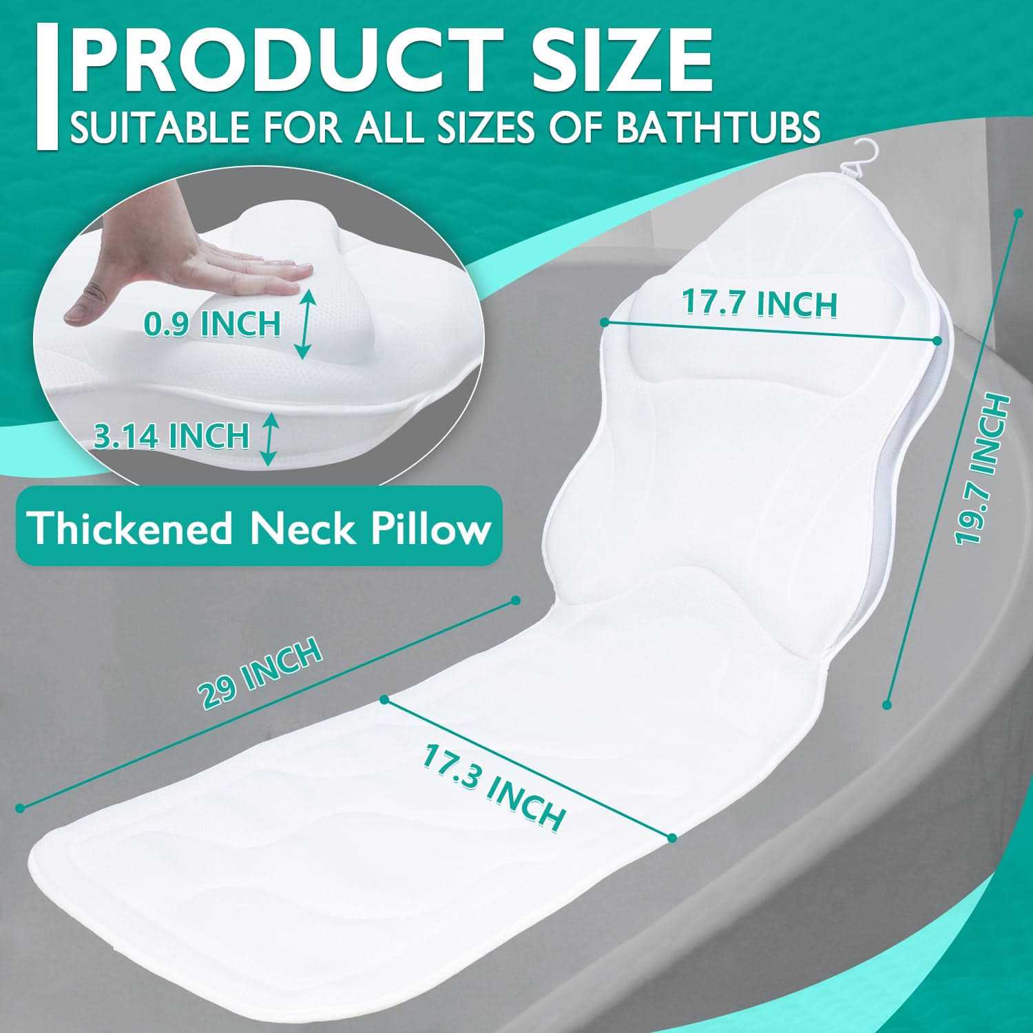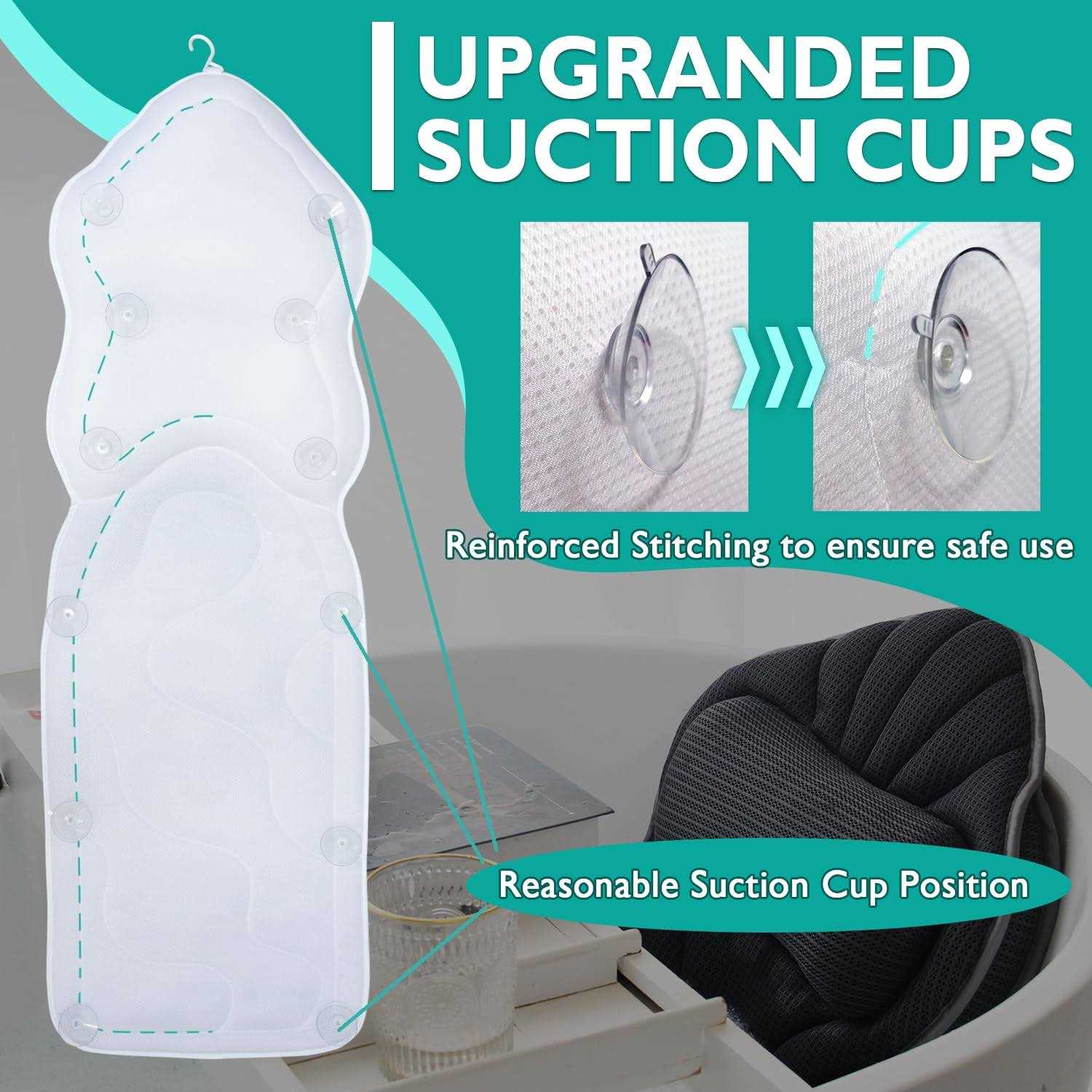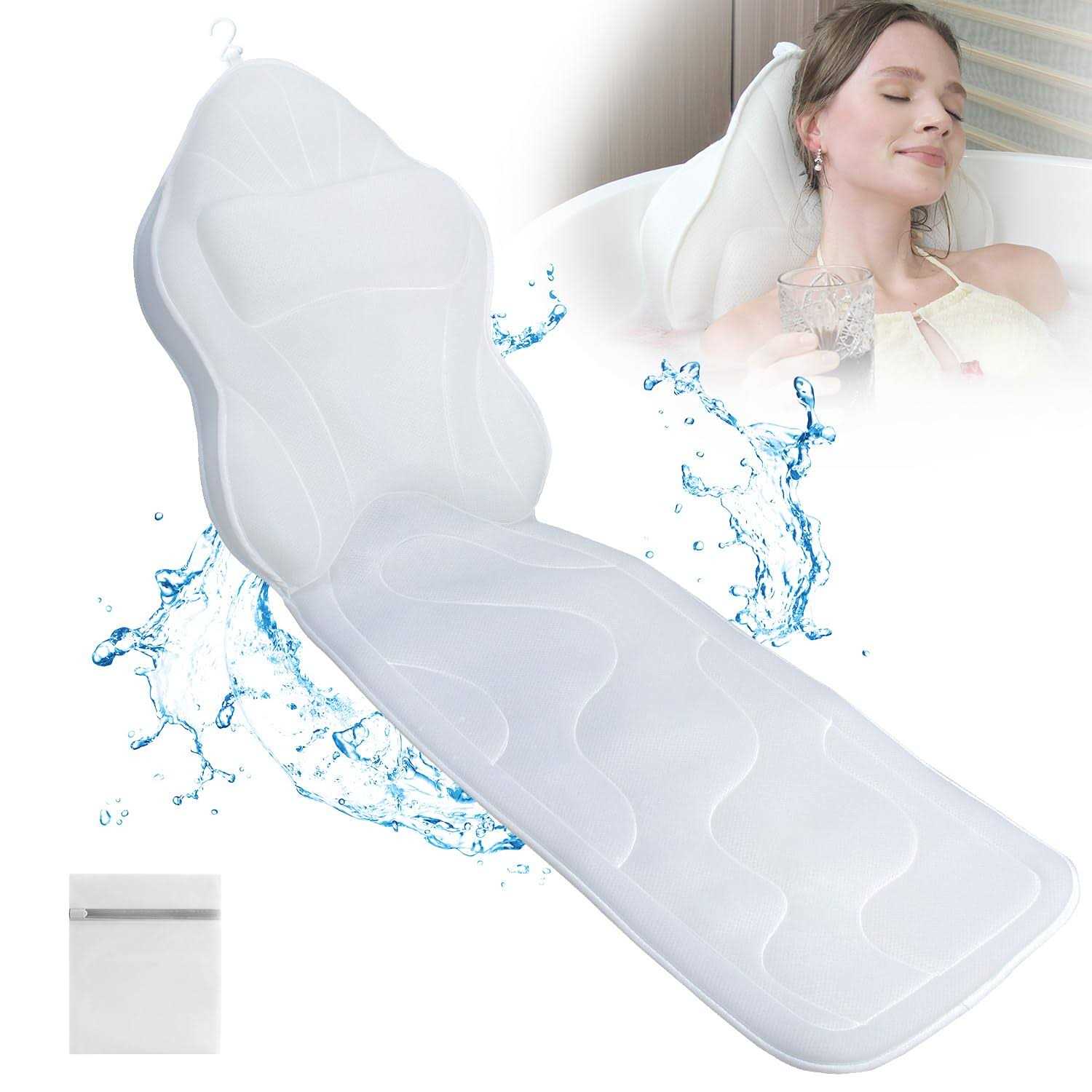 our full body bath pillow, the ultimate in comfort and support. This pillow envelops your body in a soft, breathable cushion, relieving pressure on your back, shoulders, and tailbone while providing blissful support to your neck and head. Say goodbye to the annoyance of suction cups that don’t stick – our bath pillow features 12 powerful anti-slip suction cups, ensuring a secure and stable grip on any smooth surface. Crafted with 3D Air Mesh Technology, our pillow is water-permeable and breathable, allowing for quick drying. A built-in hanging hook makes drying and storage a breeze. Perfect for bath lovers and those seeking the ultimate relaxation, our bath pillow also makes a thoughtful and practical gift. Bestow a touch of joy and comfort on the daily routines of your friends and family with this versatile, gift-worthy item.