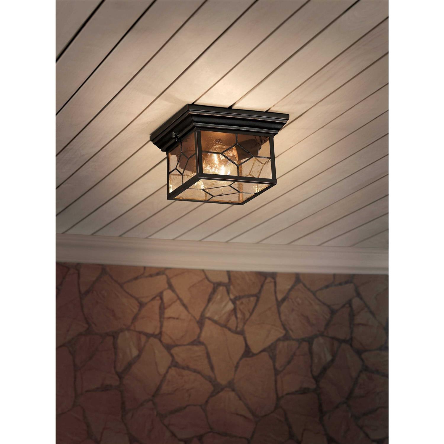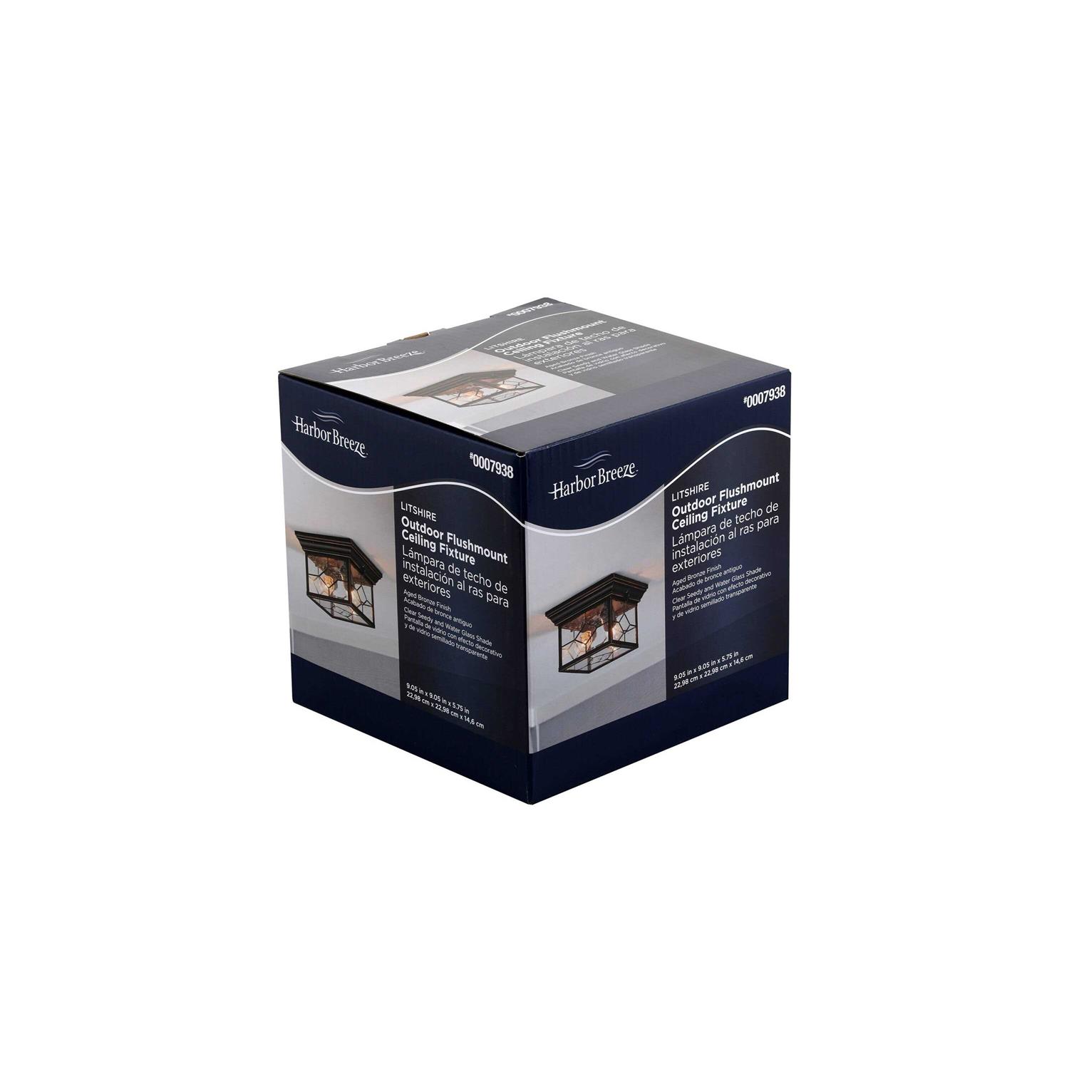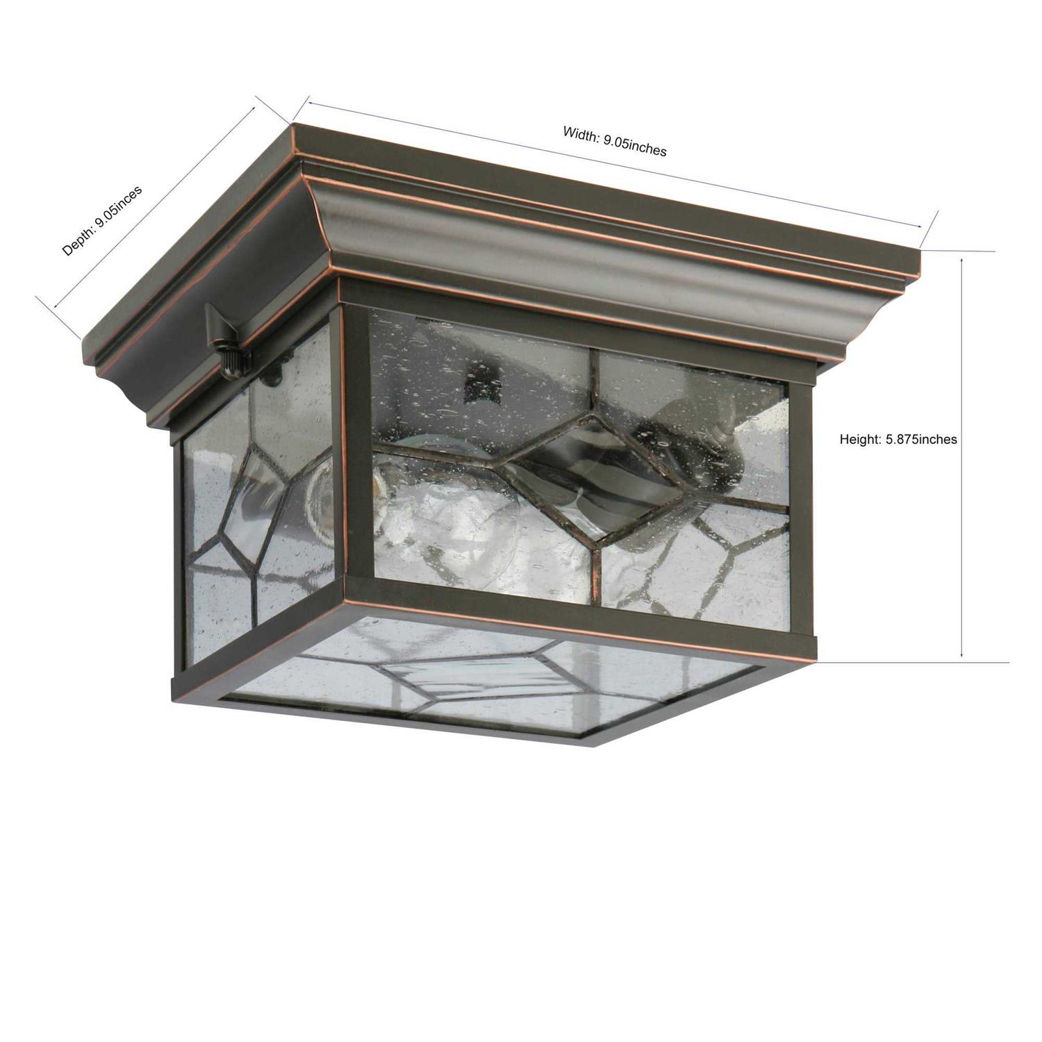 The Portfolio Litshire 9.05-in W oil rubbed bronze outdoor flush-mount light is complemented by clear seeded and clear water glass. The Litshire outdoor flush-mount is damp location rate and is the perfect fixture for your entrance covered patio area and garage. It is made of a long-lasting cast aluminum frame and utilizes a durable powder coat finish. It requires 2 60 watt medium base A19 bulbs not included and it is compatible with dimmable circuits when used with a dimmable bulb. UL listing demonstrates this product has met minimum requirements of the widely accepted product safety standards. Dont forget to look for the other Litshire collection lighting fixtures to compliment your new outdoor flush mount.