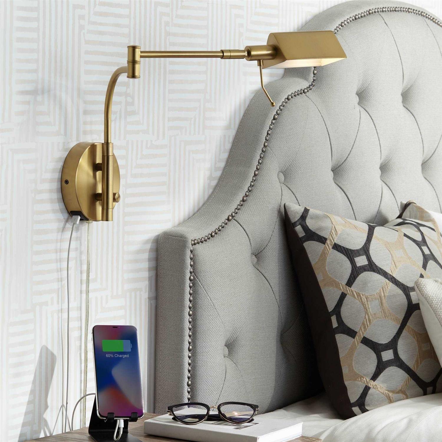 Brighten your modern bedroom, office or reading space with the Keegan swing arm plug-in wall lamp. From the Possini Euro collection, this design features a warm gold finish over its metal construction, a handy dimmer and convenient USB charging ports. Easily plug in the lamp with no hardwire installation required.