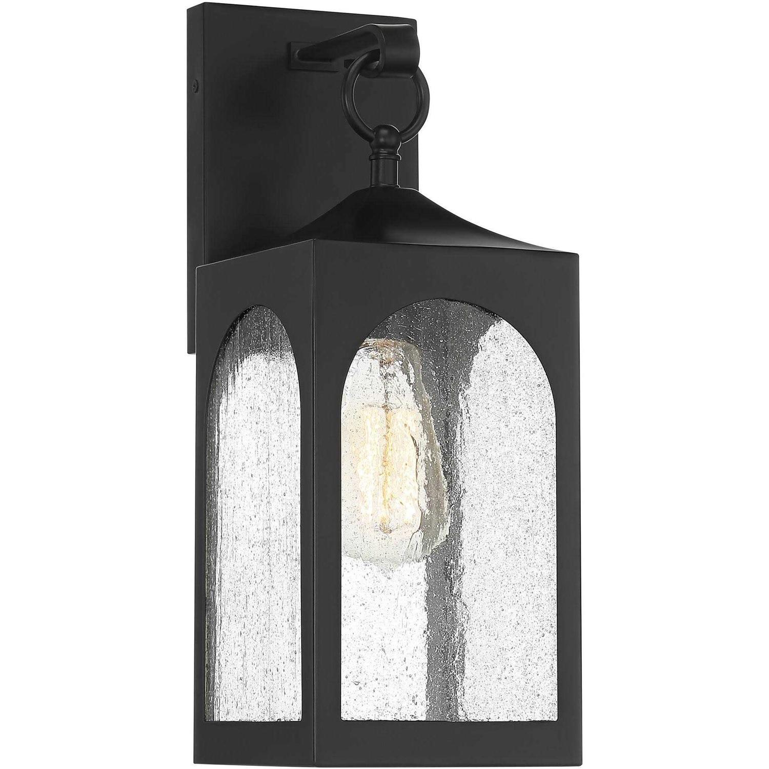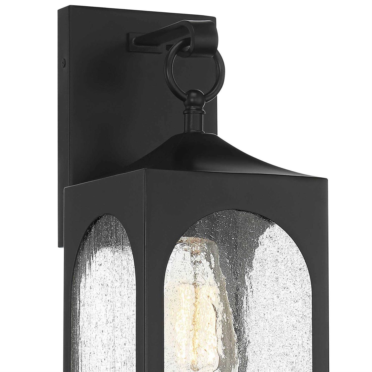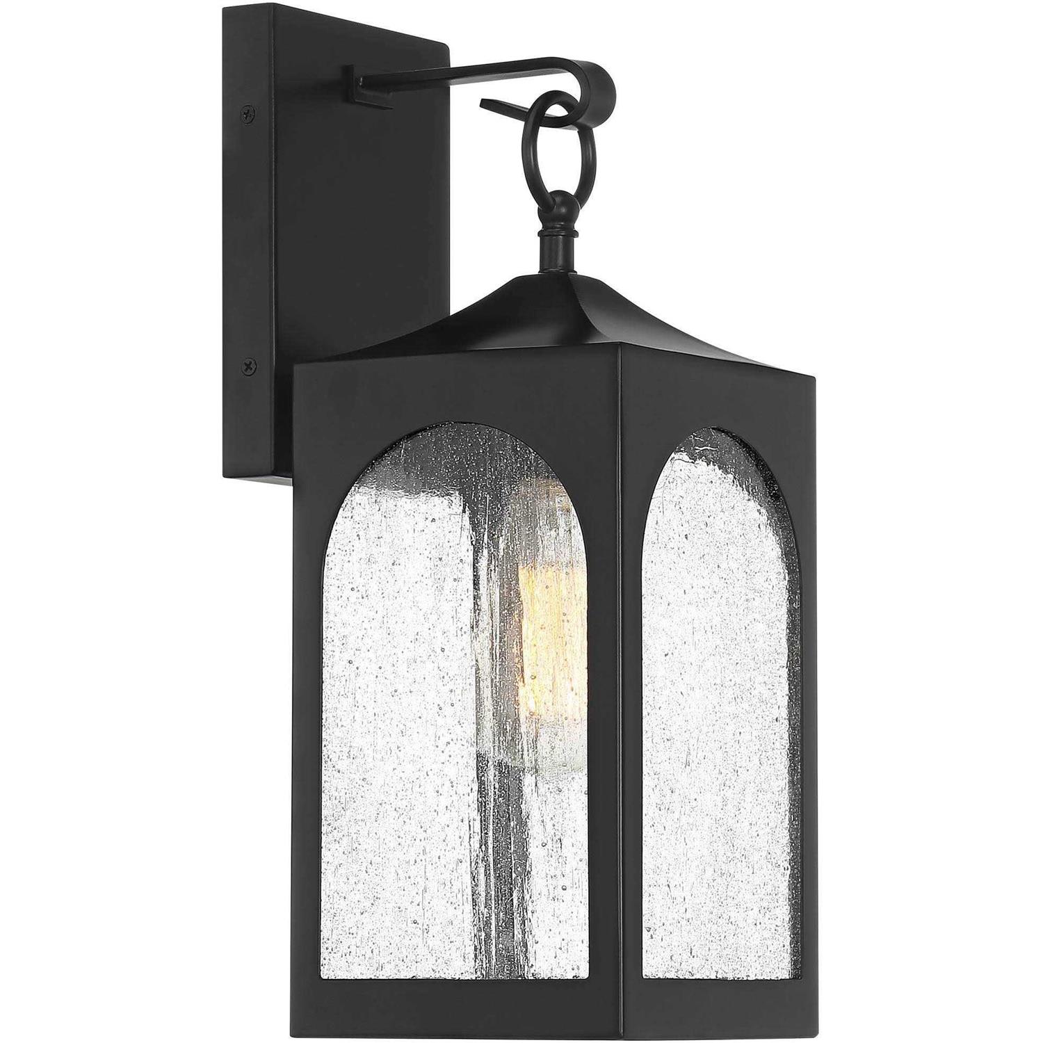 A geometric shape with gentle curves creates the silhouette of this charming outdoor wall light. A matte black finish and seedy glass create a look that seems weathered, but provides a contemporary feel. The illumination from a single bulb is gently diffused, perfect for flanking the sides of an entryway or enhancing a patio space.