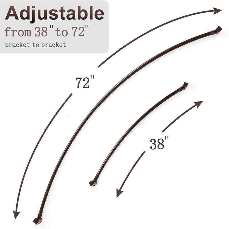 Corrosion Resistant: This bronze finished adjustable curved shower rod is made of good quality aluminum,ensuring quality and longevity.NON-plastics, ensuring the curved shower rods durability,longevity and never rust.. Customize To Fit Your Shower: Telescoping design for this curved shower curtain rod adjusts between 38 and 72 inches and is the ideal solution for showers in your bathroom. Expand and adjust to your specific bathroom layout. Curved design of this bathroom shower rod provides up to 9 inches of extra elbow room and shower space. Extra Space: Unlike traditional straight tension shower poles,our premier curved design sweeps around your tub maximizing space and giving you a more enjoyable showering experience in your bathroom. Easy Installation: Screws and mounting brackets are included for secure permanent installation for this expandable shower rod. Easily mount to your wall. Installation Tips: This bathroom shower rod curves at a 22-degree angle. For best fit, order a shower curtain that is 6 inch – 12 inch wider than the shower rod.To determine your rod size, measure straight across from WALL to WALL. Curves in the rod and mounting brackets are already accounted for.