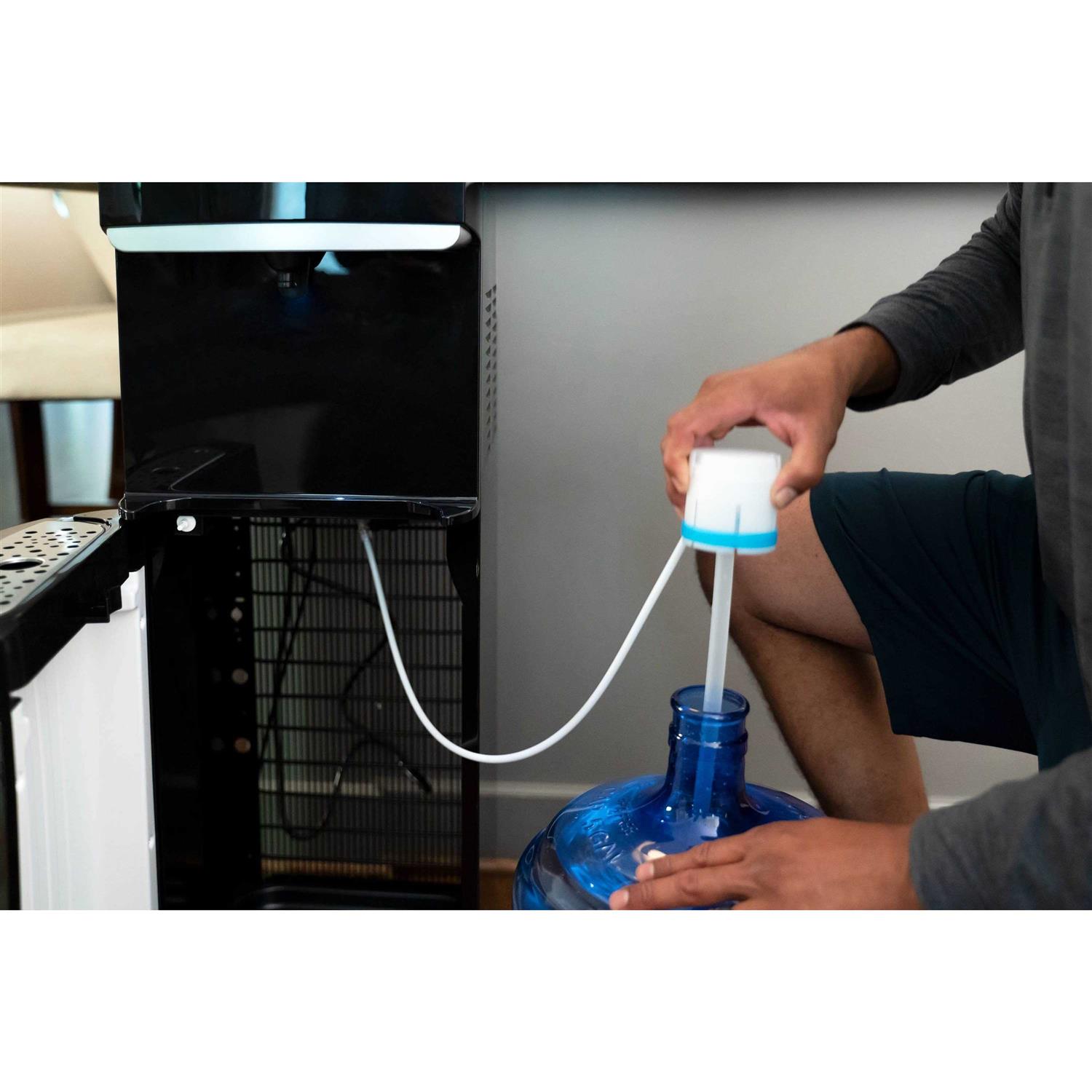 Get the convenience of a water dispenser without any of the heavy lifting. The Primo Deluxe Bottom Loading Water Dispenser has a discreet and modern bottom-loading design that eliminates lifting and risk of spillage, while still providing easy access to piping hot, refreshingly cold or room temperature water at the push of a button. Updated with a new Lowe’s-exclusive look you won’t find anywhere else, this versatile stainless steel dispenser is made with everyday practicality in mind thanks to features like a child-safety lock, a removable dishwasher-safe drip tray, LED indicators and quiet heating and cooling. Easy, no-plumbing installation makes it the perfect fit for offices and homes of all sizes. To use, simply slide any compatible 3 or 5 gallon jug into the dispenser cabinet, then let it do the rest as it heats and cools your water to the perfect temperatures. Visit Lowe’s to find convenient, great-tasting Primo Pre-Filled Exchange Water for your dispenser. Primo Pre-Filled Exchange Water is purified with a 9-step reverse osmosis process to ensure pure drinking water that’s free of contaminants, while our environmentally-friendly bottles are thoroughly inspected and sanitized after each recycling. Stay hydrated and sip happy with better quality water.