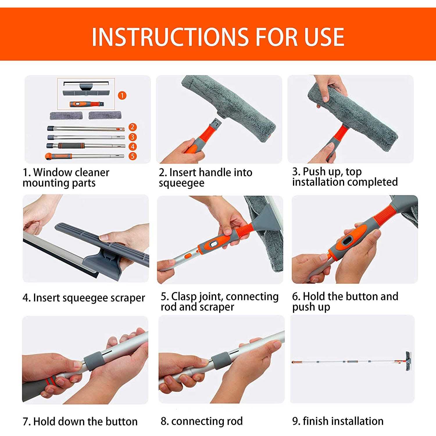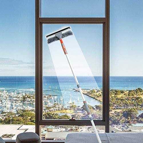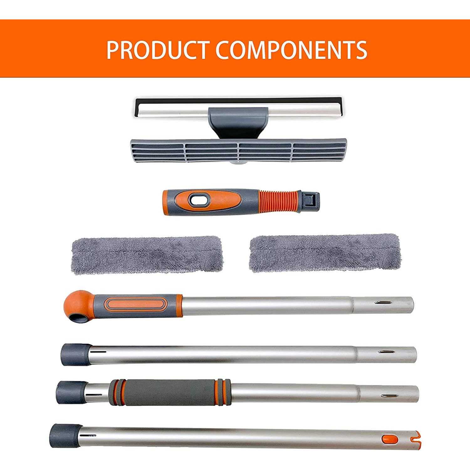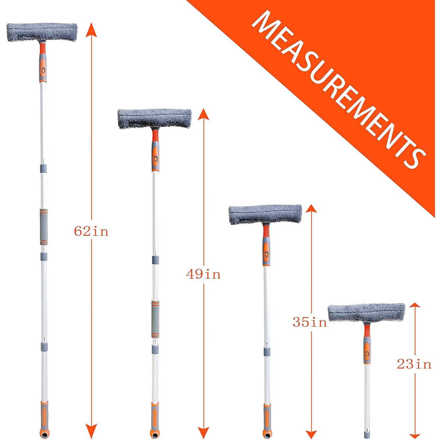Professional Window Squeegee Cleaner, 2 in 1 Shower Squeegee with Extension Pole, 62‘’ Telescopic Window Washing Equipment with Bendable Head, Glass Cleaning Tools for Indoor/Outdoor High Window 2 IN 1 WINDOW WASHING EQUIPMENT KIT — The multi-purpose window squeegee has a bendable head and free replacement Microfiber Cloths, which makes cleaning windows quicker and cleaner. Ideal for outdoor and indoor glass surfaces, it can also be used as a windshield cleaning tool.ed multiple times. LIGHTWEIGHT & REACH ANWHERE — This set comes with a 4-Section, Aluminum Extendable Pole for a total length of 62 inches. Simply link the safety buckle without rotating, Sufficient length to clean outdoor high windows without the need for extra ladders or stools, Safe and convenient. STREAK FREE SQUEEGEE — Enjoy a smooth squeegee glide. No streaks. The flexible head makes it easy to clean high-rise windows without walking, making cleaning windows a simple and fun thing to do. MICROFIBER WINDOW SCR