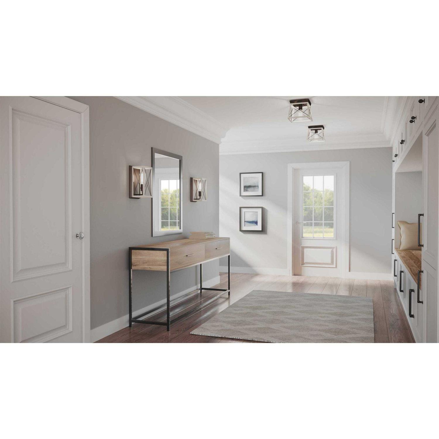 The Briarwood collection features a classic pattern commonly found on barn or farmhouse doors and gates. The simple geometric form features a faux-painted wood enclosure to frame vintage-style light bulbs. A coastal-inspired whitewashed finish paired with Graphite details. This fixture needs to be hardwired. Professional installation is recommended.