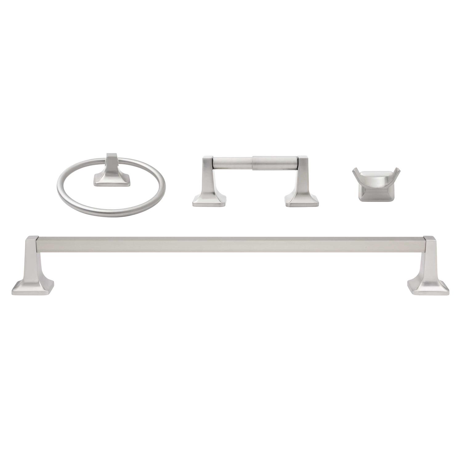 The sleek, simple design elements complement most styles from contemporary to traditional. All pieces coordinate perfectly and feature concealed mounting hardware for an attractive, clean finish. This convenient kit provides a beautiful accent to help keep your bathroom organized and tidy.