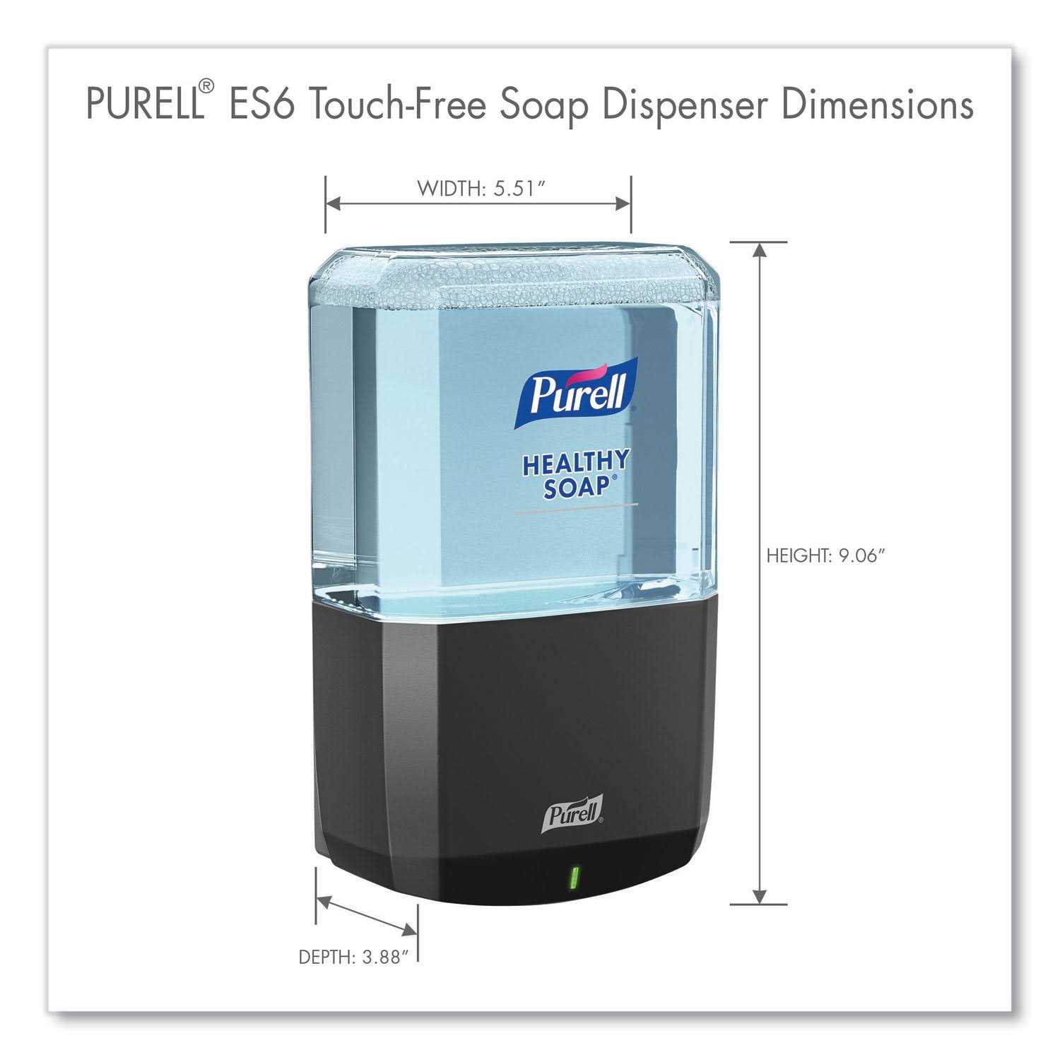 The PURELL ES6 Touch-Free Soap Dispenser – Graphite includes 4 “C” cell batteries. It’s a convenient dispenser that has been calibrated for the optimal amount of soap for best hand washing practices. It’s also fully ADA compliant, and can be locked when not in use thanks to the LOCK OR NOT technology included.