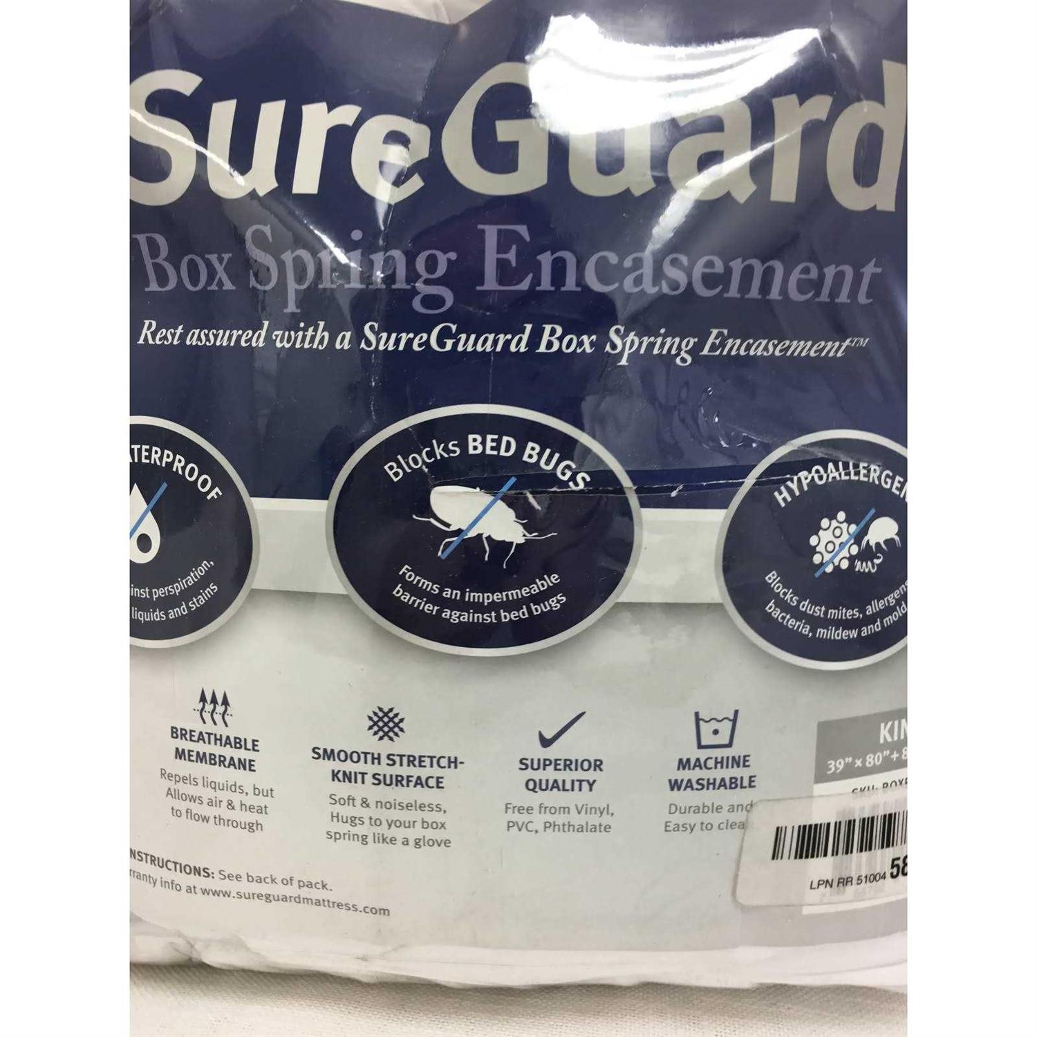 100% Waterproof – Six-sided premium protection against everyday liquids and stains; 10-year quality guarantee Bed Bug Proof – Super fine zipper with Invisi-Zip and SureSeal technology completely seals off the box spring from bed bugs – use with a SureGuard Mattress Encasement Hypoallergenic – Keeps Your Box Spring Clean & Fresh – Blocks dust mites, mold, mildew, pollen and pet dander on all sides. Soft & Noiseless – Smooth stretch-knit surface hugs to your box-spring like a glove – Free from Vinyl, PVC, Phthalates, fire retardants and other toxic chemicals Full (54 in x 75 in) – Fits 8 to 11 inches deep; Zippered Box Spring Cover – Machine wash and dry. Independently lab tested and GREENGUARD Gold certified. Want the Ultimate Protection for Your Box Spring? Look No Further than a SureGuard Box Spring Encasement Full Size: 54 x 75 inches. 100% Waterproof Provides six-sided premium protection against liquids and stains – keeping the entire box spring fresh and clean. Bed Bug Proof Super fine zipper with Invisi-Zip and SureSeal technology completely seals off your box-spring from bed bugs – best used with a SureGuard Mattress Encasement and SureGuard Pillow Protectors. Allergy Relief Blocks dust mites, mold, mildew, pollen and pet dander – prolonging the life of your boxspring. Soft and Noiseless The smooth stretch-knit surface hugs to your box-spring like a glove – Fits 8 to 11 inches deep. Easy to Install Includes step-by-step instructions and free adhesive felt pads to cover any sharp edges on your bed frame. Simple to Clean Machine wash with cool water. Tumble dry low heat or air dry. Do not bleach, iron, or dry clean. Superior Quality Each zippered box spring cover is made with the finest materials and expert workmanship to ensure it protects your box spring, wash after wash. Independently lab tested and GREENGUARD Gold certified. Free from Vinyl, PVC, Phthalate. Rest Assured with SureGuard.
