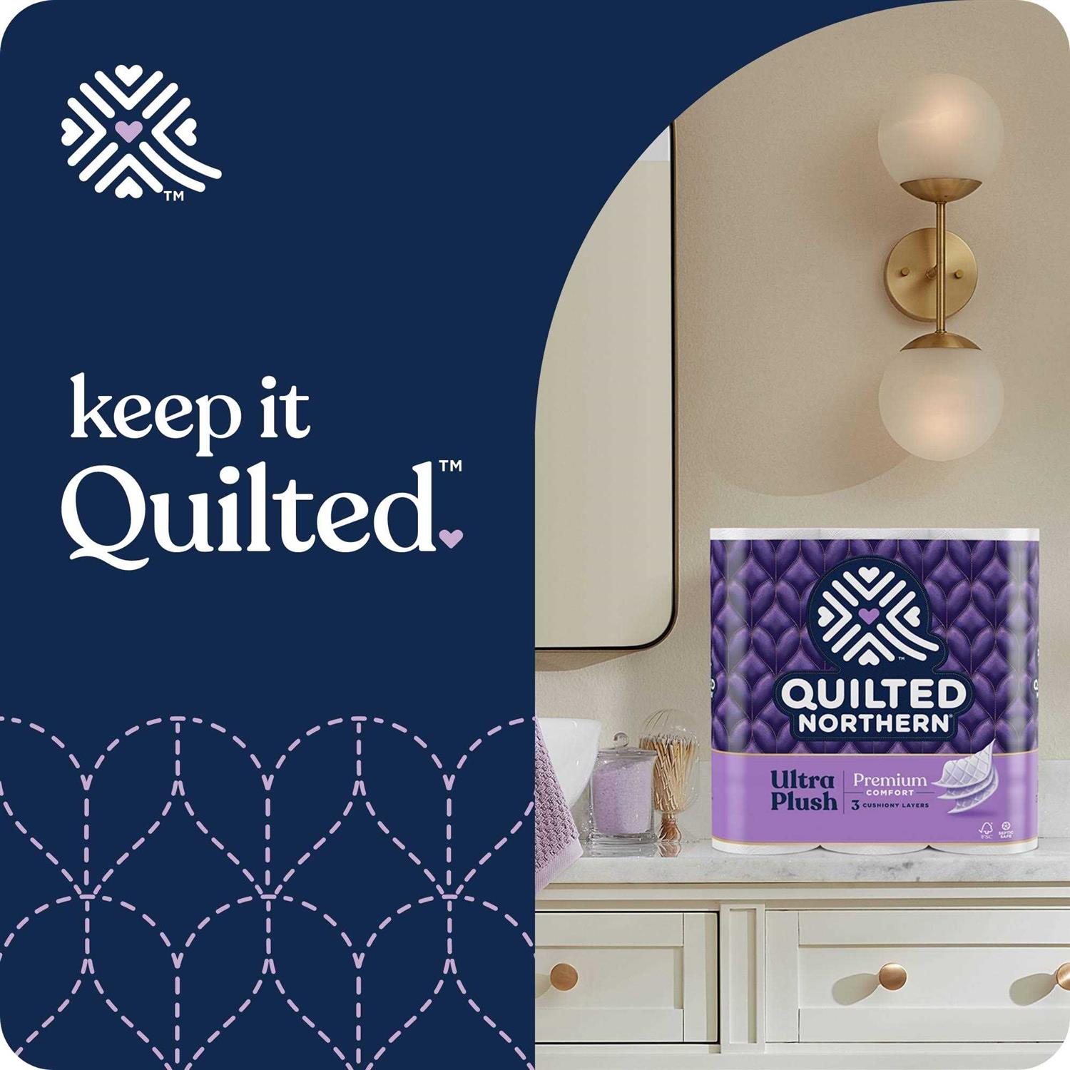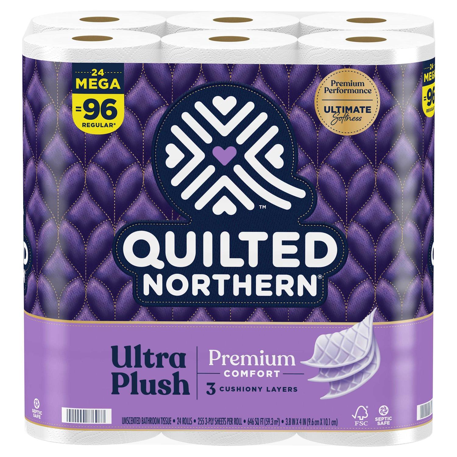 Treat yourself to the ultimate softness of Quilted Northern Ultra Plush toilet paper. Featuring 3 cushiony-soft layers in every sheet, Quilted Northern Ultra Plush bath tissue is 3X thicker and 3X more absorbent than the leading value brand, and you can enjoy all the signature softness without worrying about lint. Quilted Northern Ultra Plush toilet paper is made from responsibly sourced trees. Each Mega Roll toilet paper has 255 sheets, so in total, you are getting over 6,000 sheets of Quilted Northern Ultra Plush bathroom tissue! Each bulk toilet tissue pack contains 24 Mega Rolls, equal to 96 Quilted Northern Regular Rolls, so you can change the roll less often. Pamper yourself with Quilted Northern Ultra Plush toilet paper for ultimate softness and premium performance.