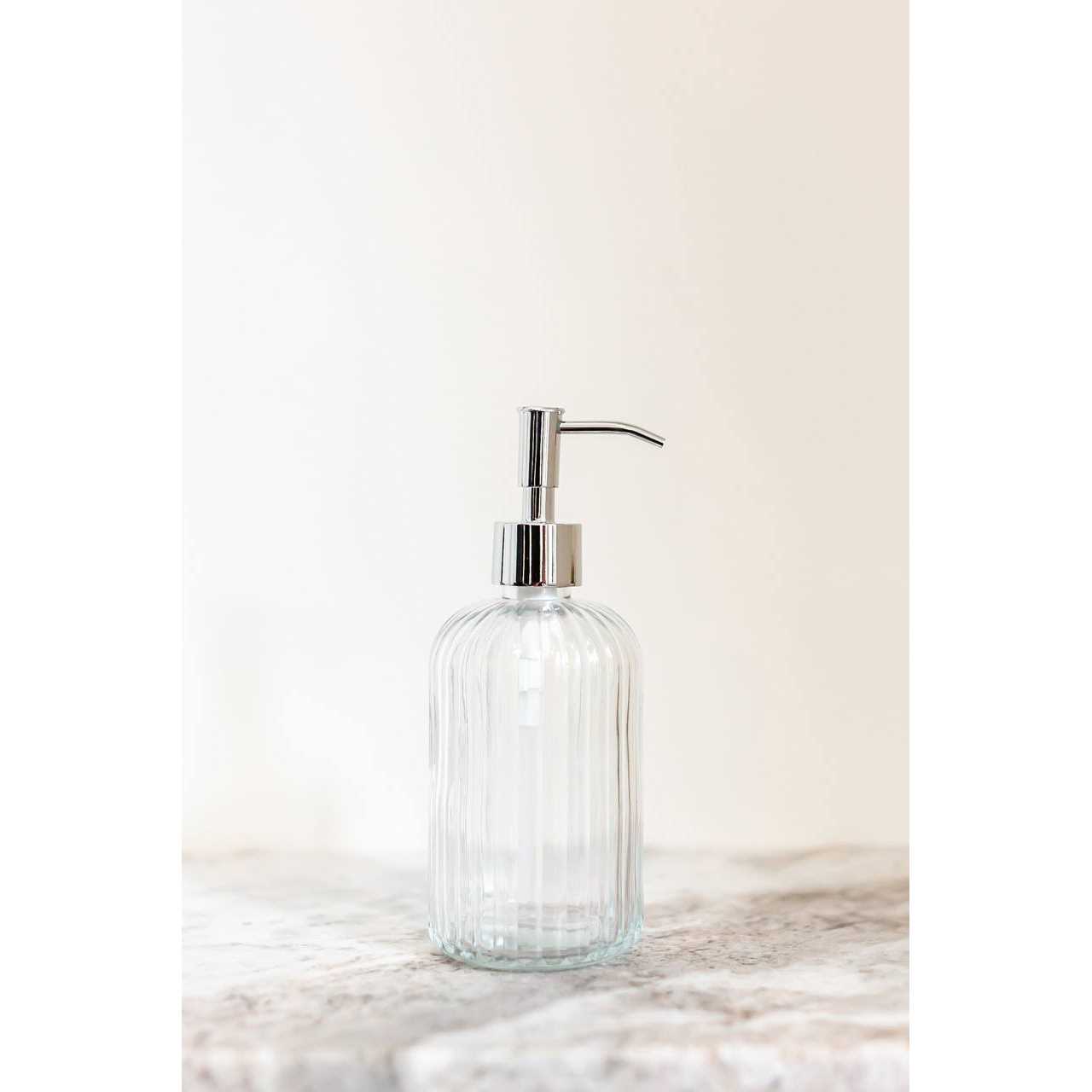Reminiscent of Vintage Parisian Art Nouveau, our Fluted Glass Soap Dispenser adds a charming style sink side in the bath or kitchen. Boasting a round base with fluted glass, this sizable soap dispenser beautifully houses a generous 12 fluid ounces of your favorite liquid hand soap or lotion. Houses Approx. 12 Fluid Ounces; Real Metal Soap Pump available in a Variety of Finishes ( copper, chrome, gold, bronze, brass or stainless steel ) ; Clear Glass Base with Fluted Features; Beautiful in both the Bath or Kitchen; Fill with your Favorite Liquid Hand Soap or Lotion; Sold Individually;