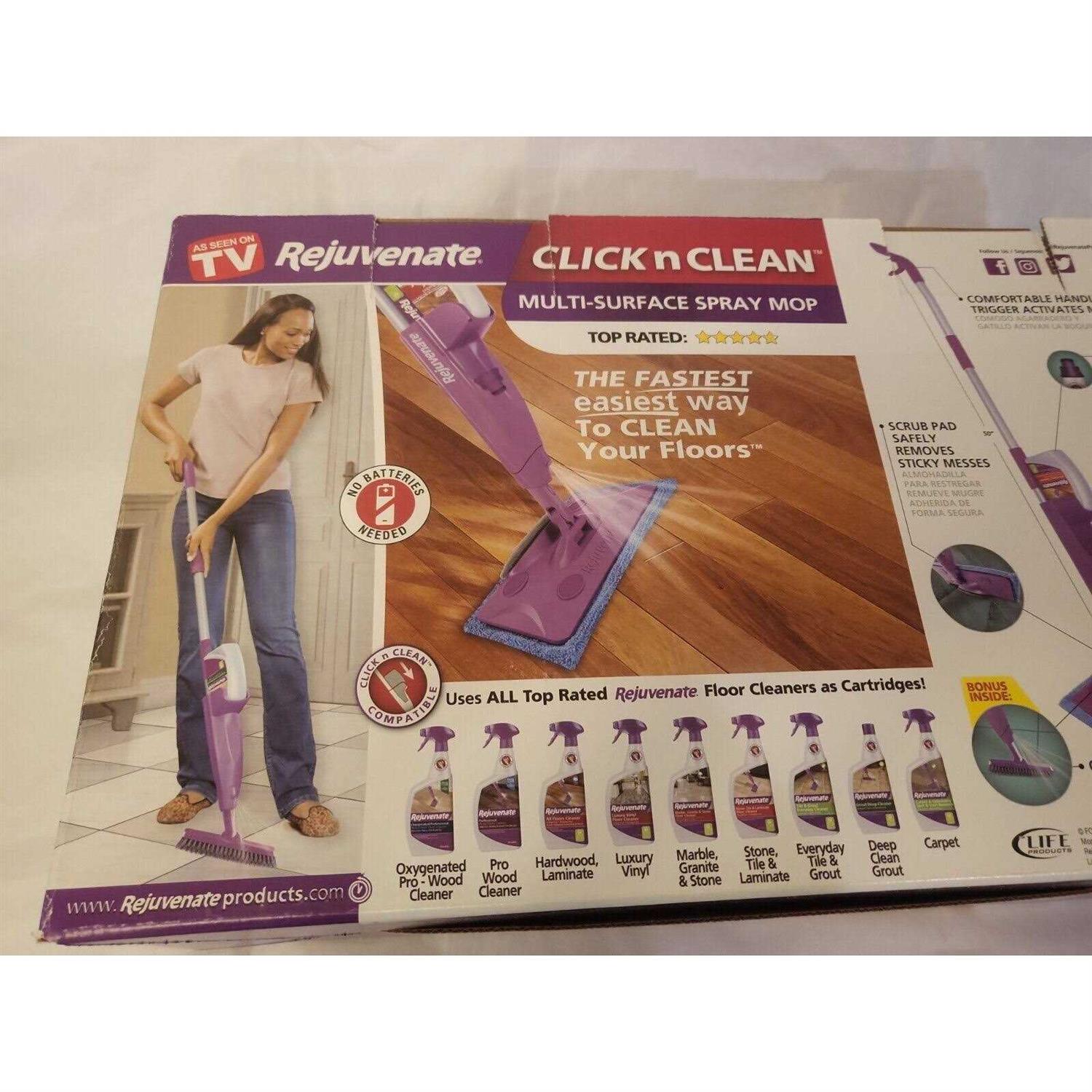 Wet & Dry Mops by Rejuvenate. Details:Rejuvenate Click n Clean Multi-Surface Spray Mop System has everything you need to eliminate dirt and grime and give your floors a brilliant clean. This all-in-one kit includes a durable mop with an extra-large pivoting head and three reusable microfiber pads. With refillable cleaning solutions that easily click into place, this versatile mop system can be used with any 32 oz or 40 oz Rejuvenate cleaner, including All Floors Cleaner, Luxury Vinyl Floor Cleaner, Wood Floor Cleaner, Stone, Tile & Laminate Cleaner and Tile & Grout Floor Cleaner. The extra-wide mop head swivels to clean hard-to-reach places and the heavy-duty scrub pad tackles stuck-on messes. Plus, the reusable microfiber cleaning pads are washable up to 100X, giving you an economical way to keep your floors looking great. Always test on an inconspicuous area before using. Spray Rejuvenate All Floors Cleaner on the floor and mop with the grain. Allow the floor to dry completely…