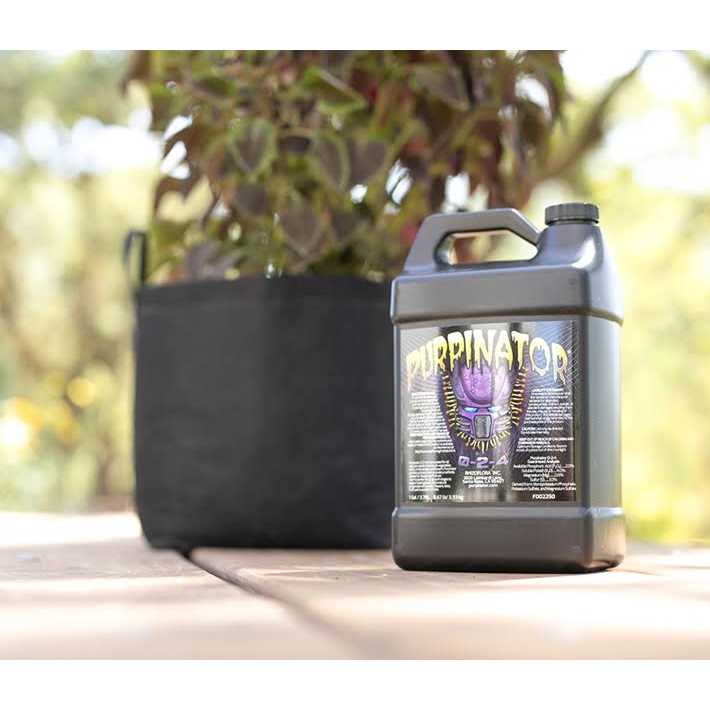 Purpinator is a specialty nutrient additive formulated to deliver increased flavonoid, terpenoid, and resin production in your plants. In addition to these benefits, Purpinator will improve the coloration of plants with purple phenotypes. Much like its predecessor, Terpinator, Purpinator activates the metabolic pathways for trichome and terpene production in plants by providing the building blocks for these processes. Purpinator will also regulate the pH of the cell sap in plant vacuoles, resulting in a more neutral cell sap pH which yields increased purple coloration expressed in the plant. Purpinator is a specialty nutrient additive formulated to deliver increased flavonoid, terpenoid, and resin production in your plants. In addition to these benefits, Purpinator will improve the coloration of plants with purple phenotypes. Much like its predecessor, Terpinator, Purpinator activates the metabolic pathways for trichome and terpene production in plants by providing the building blocks for these processes. Purpinator will also regulate the pH of the cell sap in plant vacuoles, resulting in a more neutral cell sap pH which yields increased purple coloration expressed in the plant.