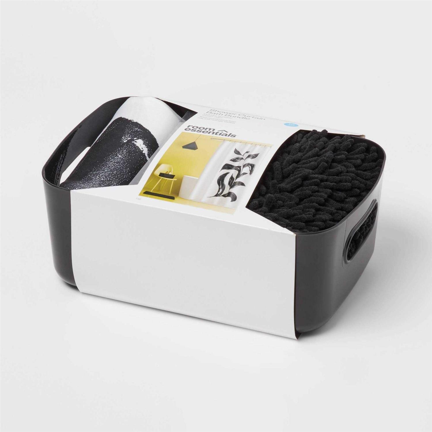 Instantly elevate your bathroom décor with the Abstract Foliage 15pc Shower Bundle Set from Room Essentials , which features an artful black floral print on an ivory background. Pair the fabric shower curtain with your favorite shower curtain liner (not included). You can keep this shower curtain and bath rug looking new by machine washing them in cold water and drying them on a low setting as needed.