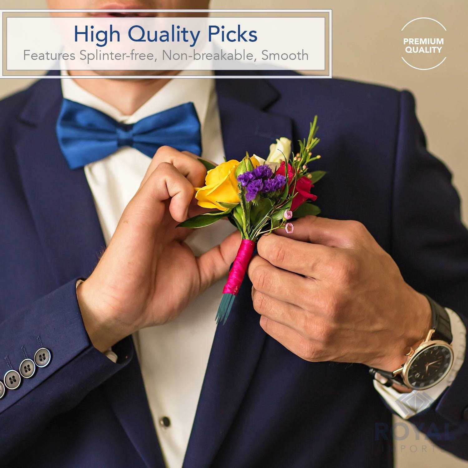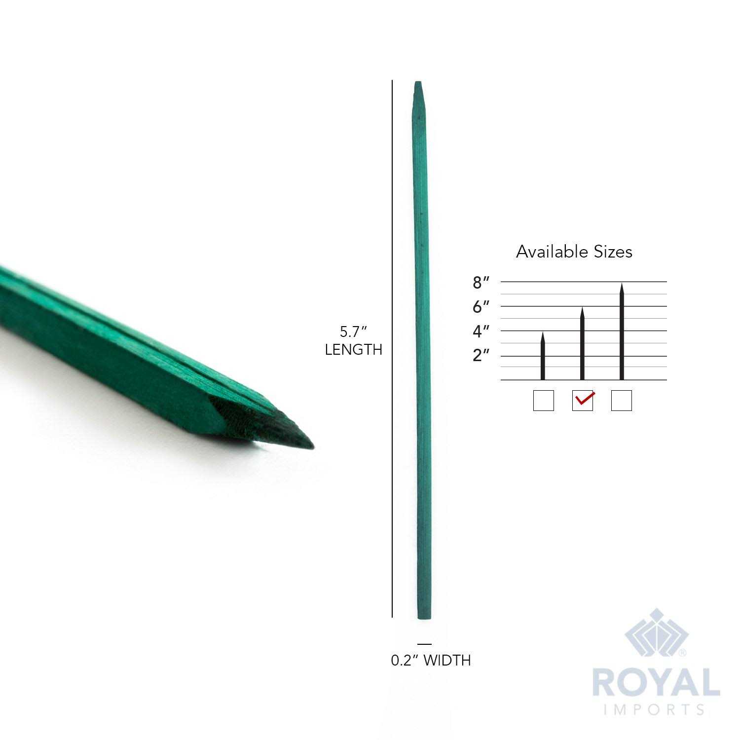 Royal Imports 100pcs 6 inch green wooden unwired picks are a great way to attach bows and crafts to your floral bouquets and projects. Makes a great crafting supply. These picks have a pointed ends with an attached wire as shown. The wood has been dyed green.