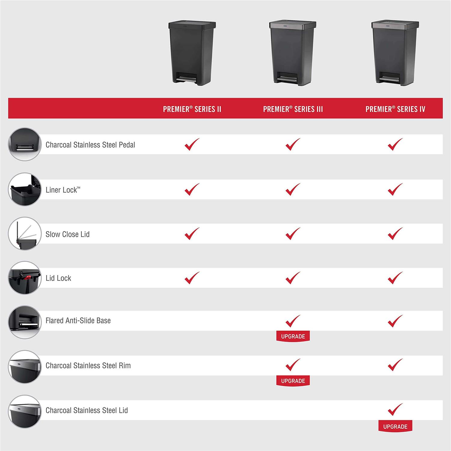 The container features a charcoal stainless-steel rim and foot pedal to complement kitchen appliances and hardware. Fingerprint resistant coating on the stainless-steel ensures a clean, premium look and feel to the container throughout the day. A flared anti-slide base adds a simple design element to mirror modern kitchen appliances while increasing container stability and the lid lock feature allows you to keep the lid opened for longer tasks or closed to keep out pets and children. Integrated Linerlock holds bags in place, while the premium stainless-steel rim hides liner bags to keep a clean look.
