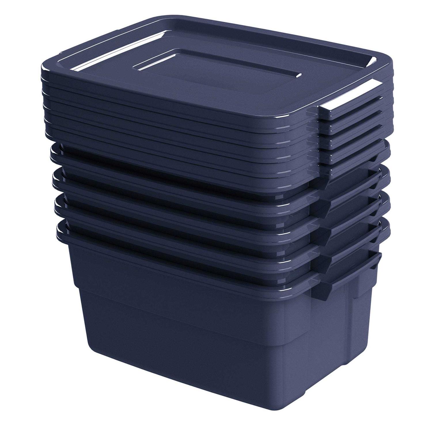 Rugged storage box features shatter-resistant polyethylene construction. Sturdy built-in handles simplify transport. Snap-on, stay-tight lids help keep contents dry and dust-free. Stackable design enables easy, space-saving storage.