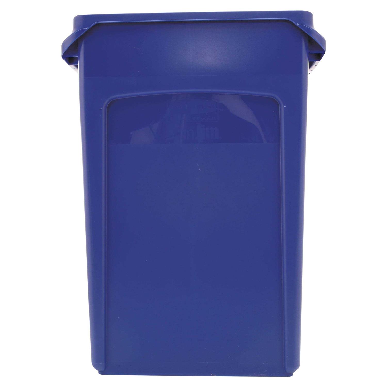 Recycling can be made much more convenient with the right tools! Rubbermaid’s Slim Jim Recycling Container is ideal for most office environments. Station the blue recycling container near the copier, printer or in the mail room for easy access. Its large capacity is ideal for heavy traffic areas, while the slim design can fit almost anywhere. Four can liner cinches improve productivity, while integrated, venting channels take the strain out of liner removal. Molded-in handles and base grips make lifting and emptying the container easier. Conveniently put the 23 gallon recycling can at a central collection site for multiple work stations. The recycling container can also be used outdoors and is designed to withstand extreme weather. This plastic slim Jim is made of recycled resin, which makes it sturdy.