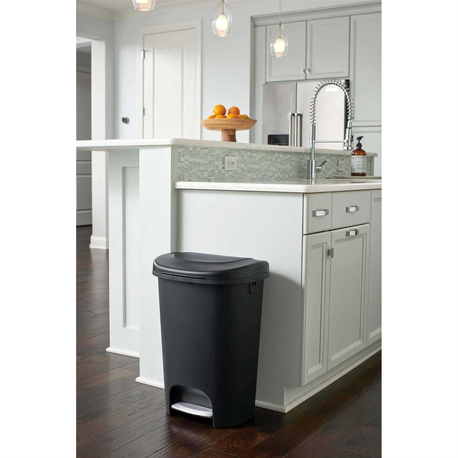 Make disposing of trash in your home easier than ever with the Rubbermaid Classic 13 Gallon Hands-Free Step-On Lid Trash Can. This trash can keeps your hands clean and holds more garbage for fewer trips to the dumpster. This Rubbermaid wastebasket has a long-lasting pedal that stands up to daily use and removes the need to touch the lid during waste disposal to keep your hands clean. The convenient pedal also stops sneaky pets from digging through the garbage and making an unwanted mess. The can features LinerLock bag wires that secure the trash bag to the rim of the can and prevents the bag from slipping. This Rubbermaid trash can is made of durable plastic resin that is easy to clean and guarantees long-lasting use. It is recommended to use this trash can indoors and is ideal for any area of your home such as the kitchen, bathroom, laundry room, or garage. Save yourself money and time by trusting in the dependable performance of the Rubbermaid Classic 13 Gallon Hands-Free Step-On Lid Trash Can.