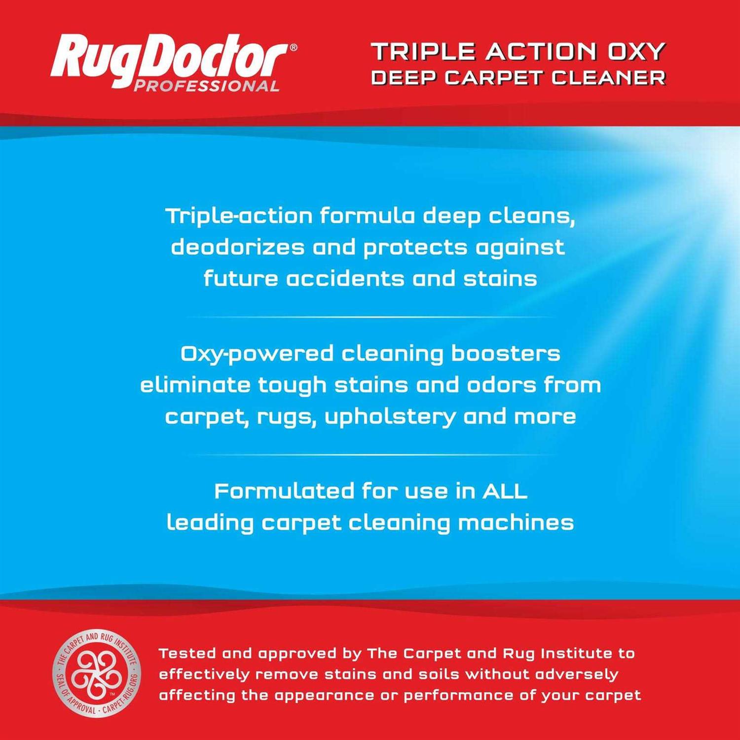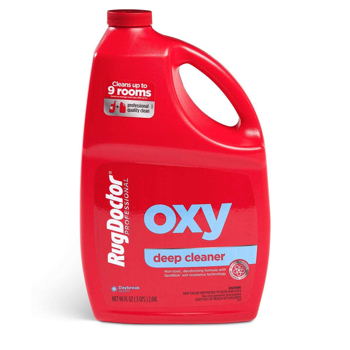 The Rug Doctor Oxy deep cleaner carpet solution is Scientifically engineered to deep clean carpets to perfection. The Oxy formula eliminates odors and lift stains by penetrating deep into carpet fibers and brings dirt and spots directly to the surface. The oxygen boosters produce professional quality results that leave carpets bright and fresh. This formula deep cleans every inch of soft surfaces from high-traffic carpets to a spot on the couch. Unlike other carpet solutions the Rug Doctor Oxy deep cleaner solution will not leave a sticky residue after it dries. This formula is also safe and gentle enough to use around children pets and won’t damage your carpet fibers. For best results use the Oxy deep cleaner carpet solution in any Rug Doctor rental cleaner or carpet cleaning machine.