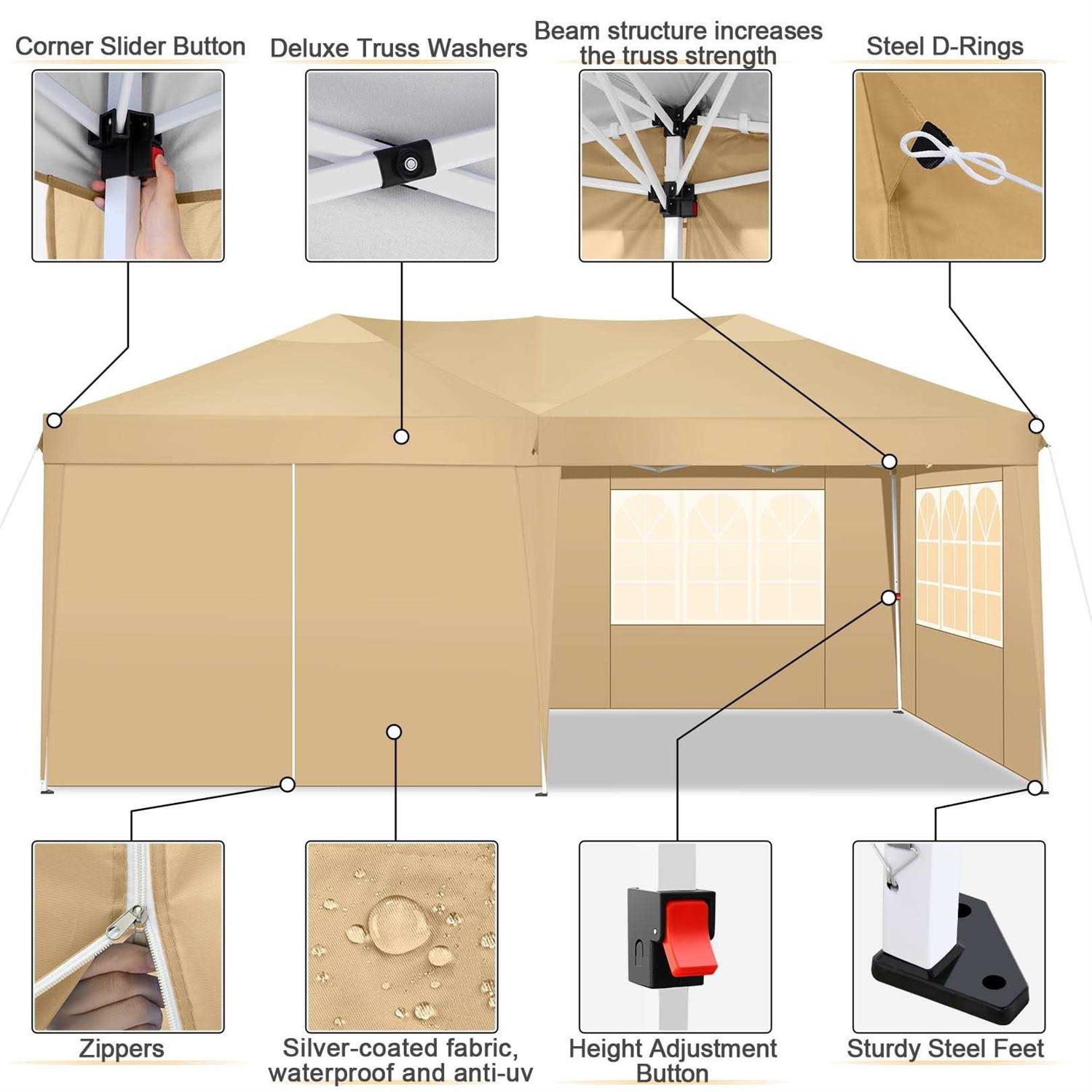 NEWEST Height-adjustable 10’x 20′ right-angle folding portable outdoor party canopy with sidewalls and mesh windows is waterproof, especially suitable for outdoor use. This canopy tent is made from a rust-resistant powder-coated steel frame and durable waterproof 210D Oxford Cloth that helps this pop up tent endure all types of weather and block up to 99% of the sun’s UV rays. besides, Our gazebo tents can be used on hard surfaces such as decks, driveways, etc. Also can be used as a temporary garage for extra storage. You can store your car or tools. Ideal for commercial or recreational use – camping, picnics, parties, backyards, markets, sporting events, etc.