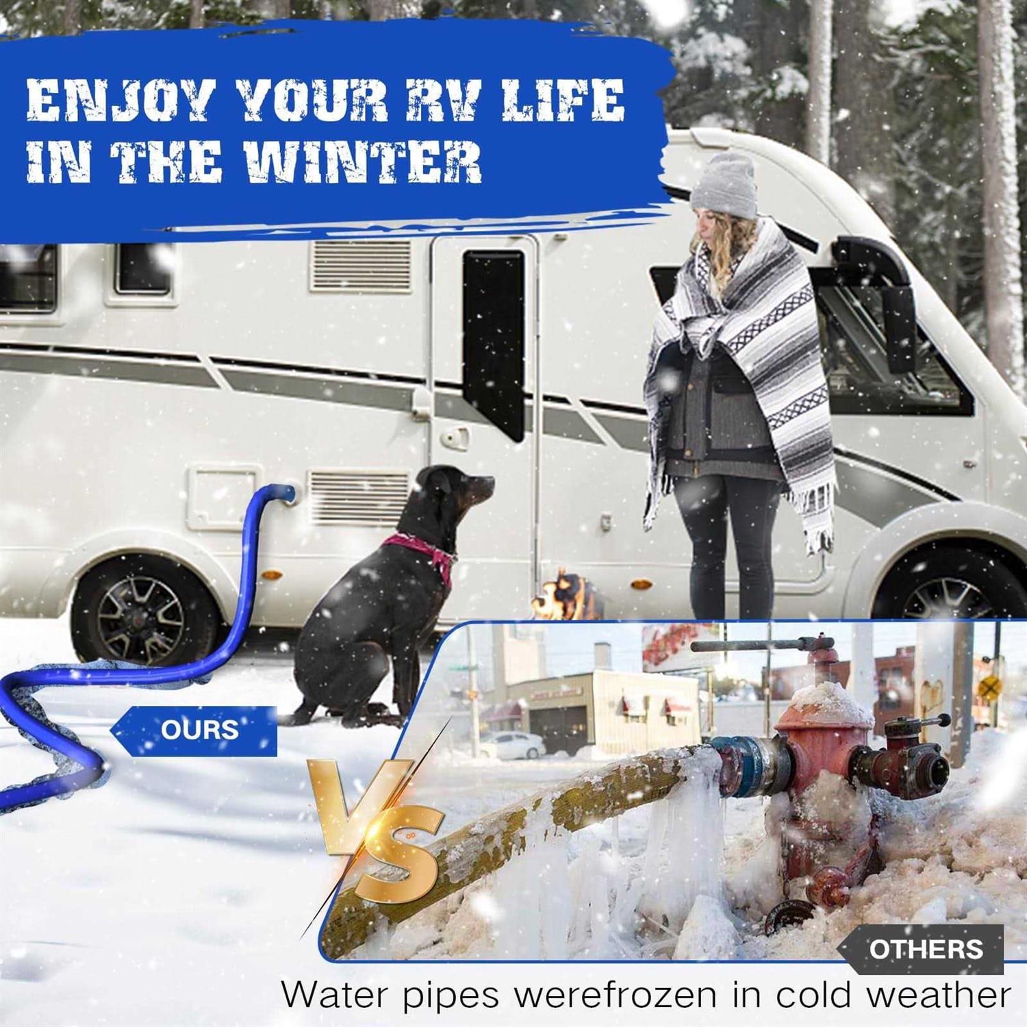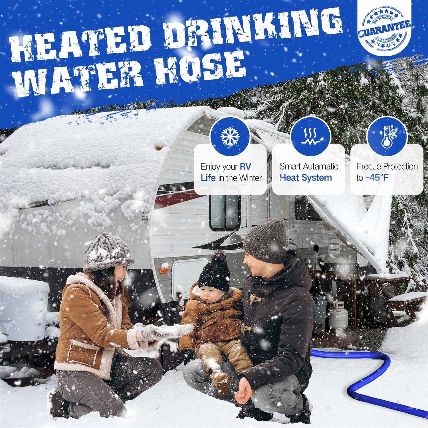 【MUTIL-SCENE APPLICATION】 The heated water hose of rv accessaries can prevent water from freezing down to -45°F (-42.7°C), and its unique intelligent temperature control system thaws ice into wate gradually. Heated water hose is made certified drinking water safe hose. It can be used in RV,camping,chicken coops, homes,gardens and on trips,Helping countless families stay away from the plight of water shortage in extreme cold weather. 【SMART AUTAMATIC HEAT SYSTEM】 Smart self-regulating external thermostat is ideal for water hose from freezing to -45°F (-42.7°C). After rigorous laboratory testing, heated water hose for RV has strong cold resistance, ensuring that the water flows unimpeded in extreme cold winter.In the midnight in most parts of the US, the temperature drops to -35°F (-37°C), so German designers created it for American considering the weather of the US. 【NO LEAKING】 The engineers of HOHOMETIC have carefully researched in the laboratory for many years, and after tens of millions of tests, the fifth version of the heated hose was finally born. Easy to install, there are instructions and videos to help each customer install water hoses. 【DURABLE AND SAFE MATERIAL】 Durable exterior jacket protects rv heated water hose of rv accessaries and smart system from damadge or exprotureCcertified RVdrinking water hose won’t leave your water tasting like plastic or leach harmful chemicals into your water. The five-layer tough water hose design and firm stainless steel connectors ensure that the water hose does not leak water and is extremely flexible.