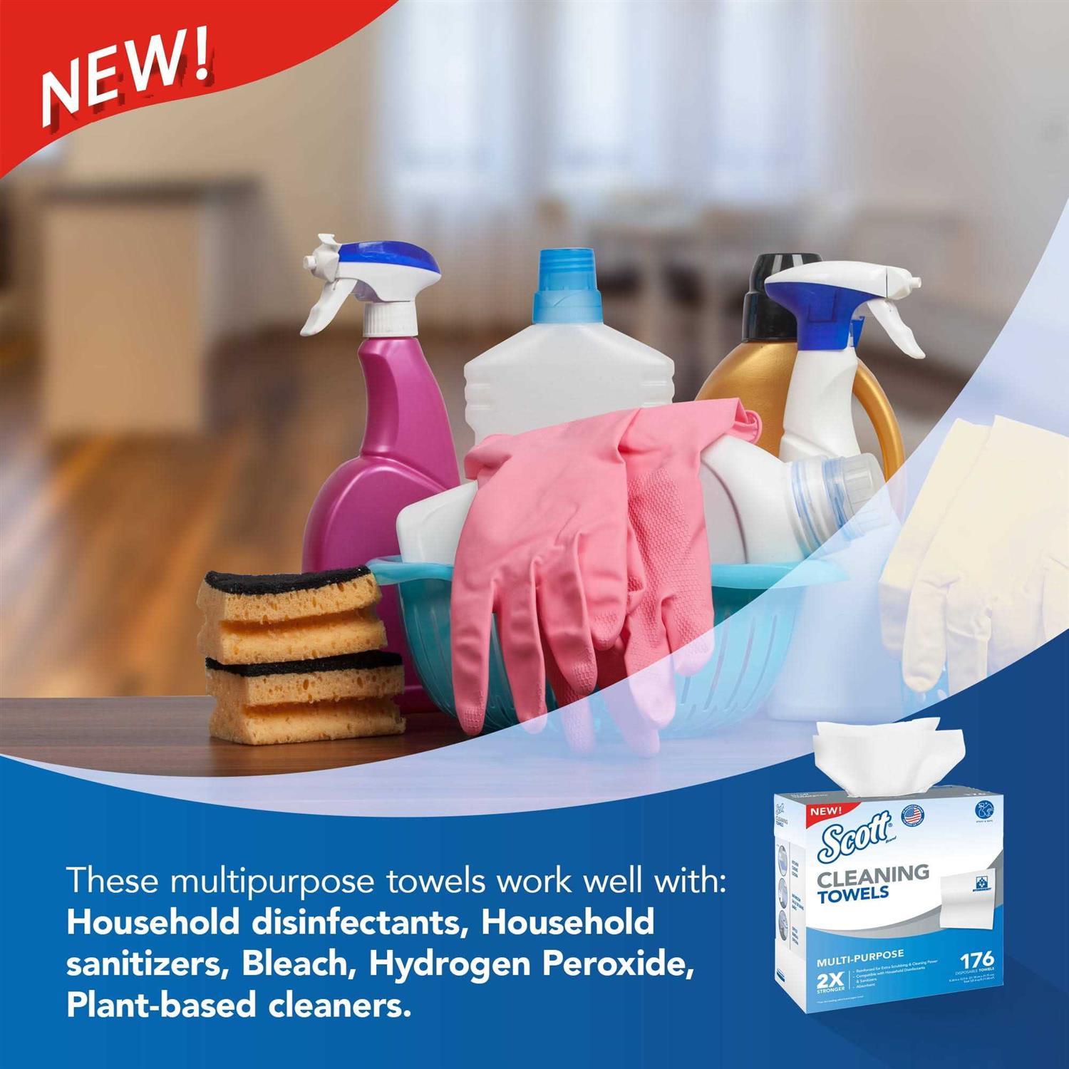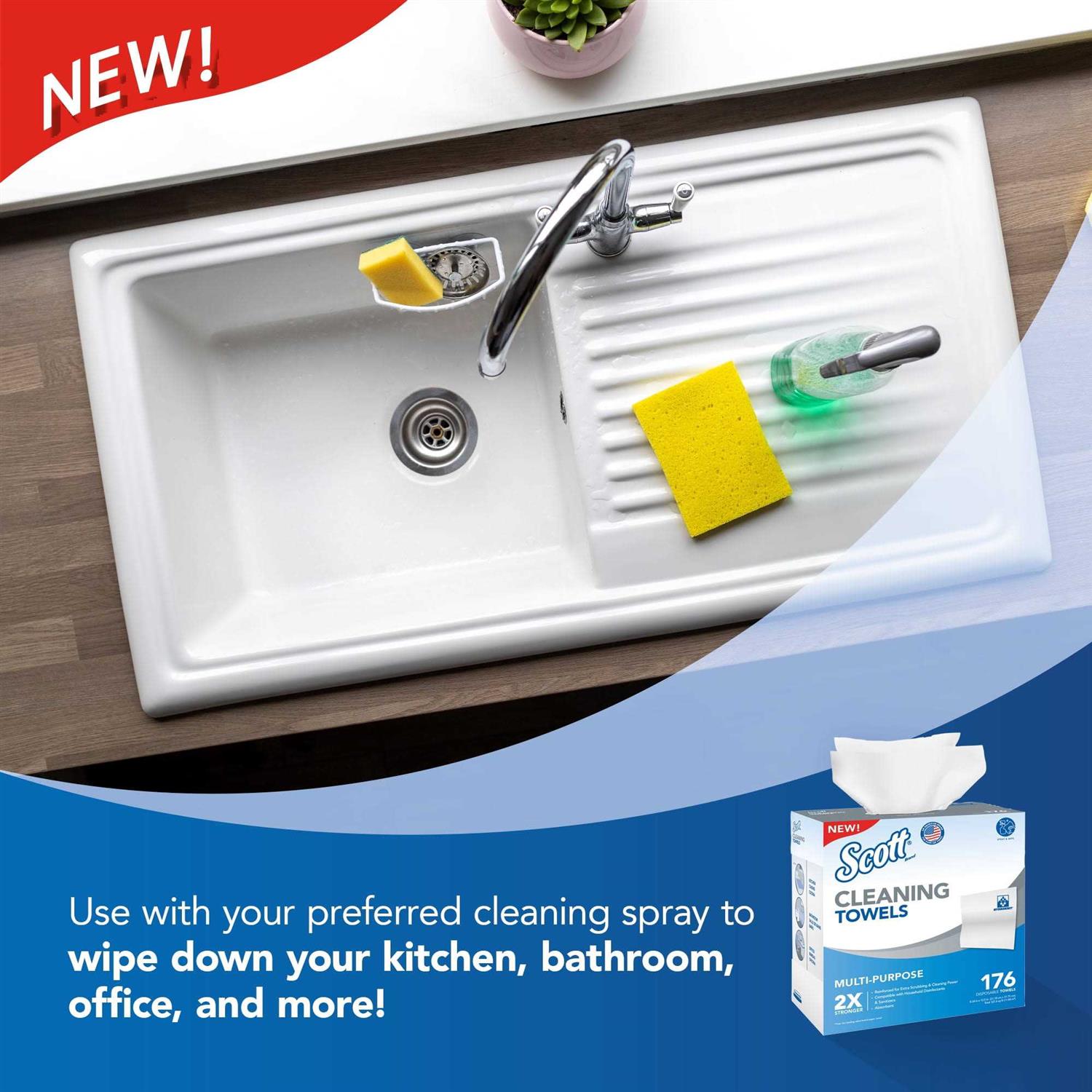 New Scott Cleaning Towels are the perfect solution for your household cleaning needs, from kitchen, to bathroom to home office. Theyre reinforced for extra scrubbing and cleaning power – 2X stronger than the leading value brand paper towel when wet! They feature HydroKnit technology, which gives them strength and durability, so they are a great choice for tough cleans around your home or business. Incredibly multipurpose, our towels can be used for a variety of tasks from wiping down countertops to scrubbing stuck-on messes. They work well with household disinfectants and sanitizers, bleach, hydrogen peroxide, or plant based cleaners and wont fall apart. Unlike cloth rags, our Cleaning Towels are safe, clean and consistent. The pop-up box format is designed for convenient, one-at-a-time dispensing and fits nicely under your sink or in your cabinets. Our large 8.34 x 12.5 sheets are big enough to tackle any job. Your kitchen paper towel cant compete! Try them today.