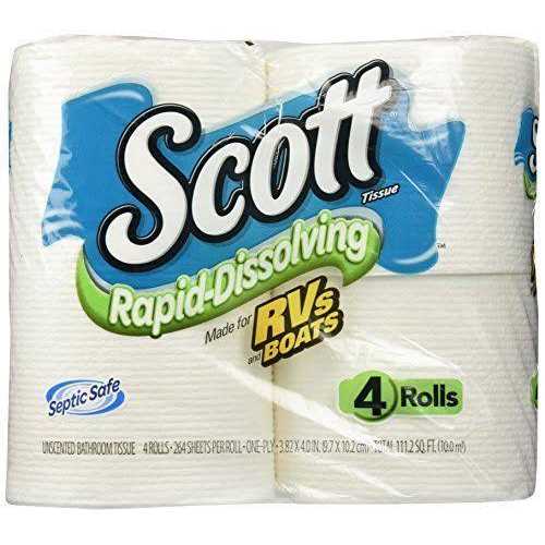 Scott 4pk Rapid-Dissolving RV Tissue breaks up four times faster than other leading brands, allowing it to dissolve so it does not clog your system. Specially made for your RV, boat or septic system, this Scott bathroom tissue is Scott Clog Clinic tested and approved, allowing you to use it with peace of mind. In a convenient 4-count pack, this Scott tissue is there when you need it, whether in your home or on the go in your recreational vehicles.