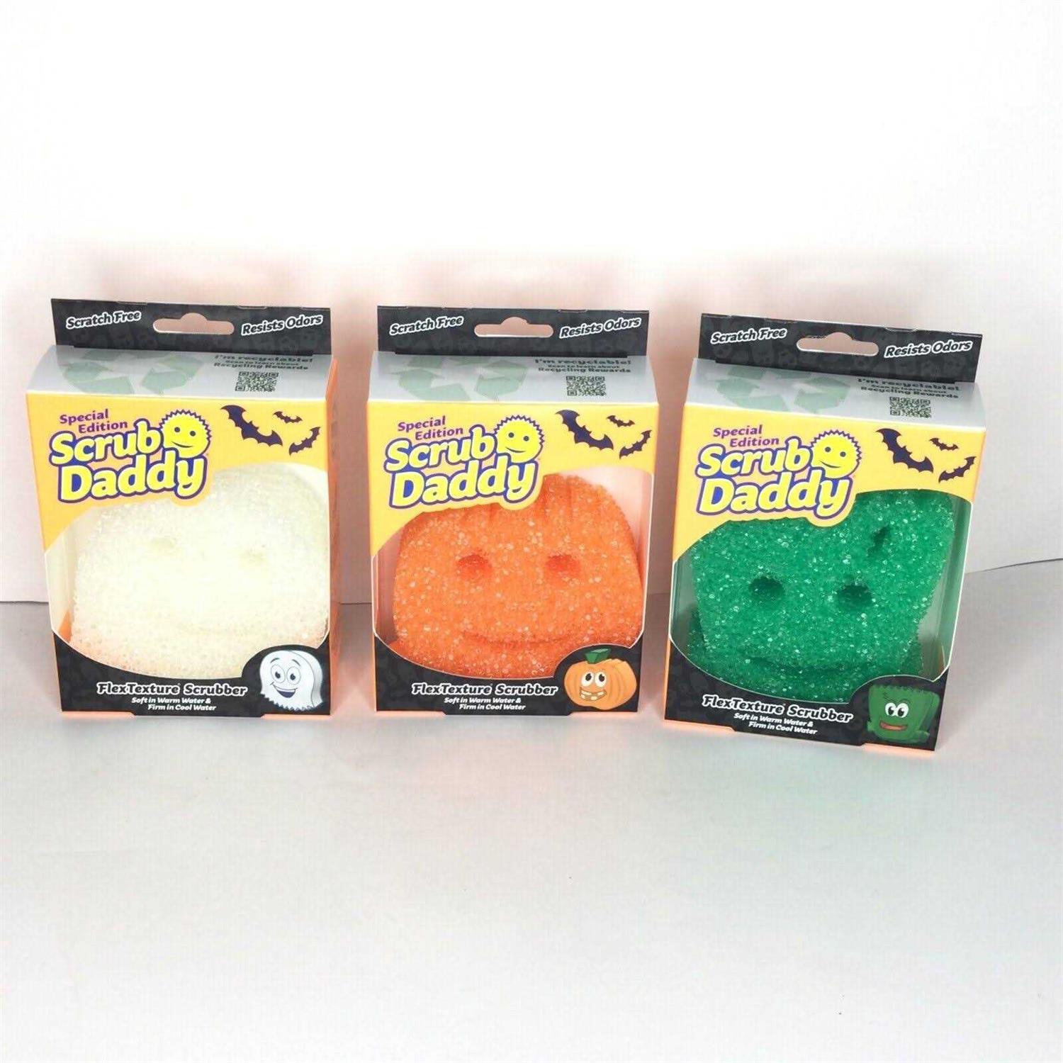 Scrub Daddy Halloween Sponges with Flex Texture are the right tool for every mess. Halloween Themed Clean. Available for a limited time. Choose from 3 spooky-shaped scrubbers. Bright orange, green, and white colors make color-coding your cleaning jobs easy. For example, assign the Frightening Frankenstein to the bathroom and the Ghoulish Ghost to pet bowls or dirty paw prints. With a design that is cute and functional, it’s hard not to smile back. His eyes hold onto you for a 360-degree reach, and his mouth cleans both sides of your utensils.