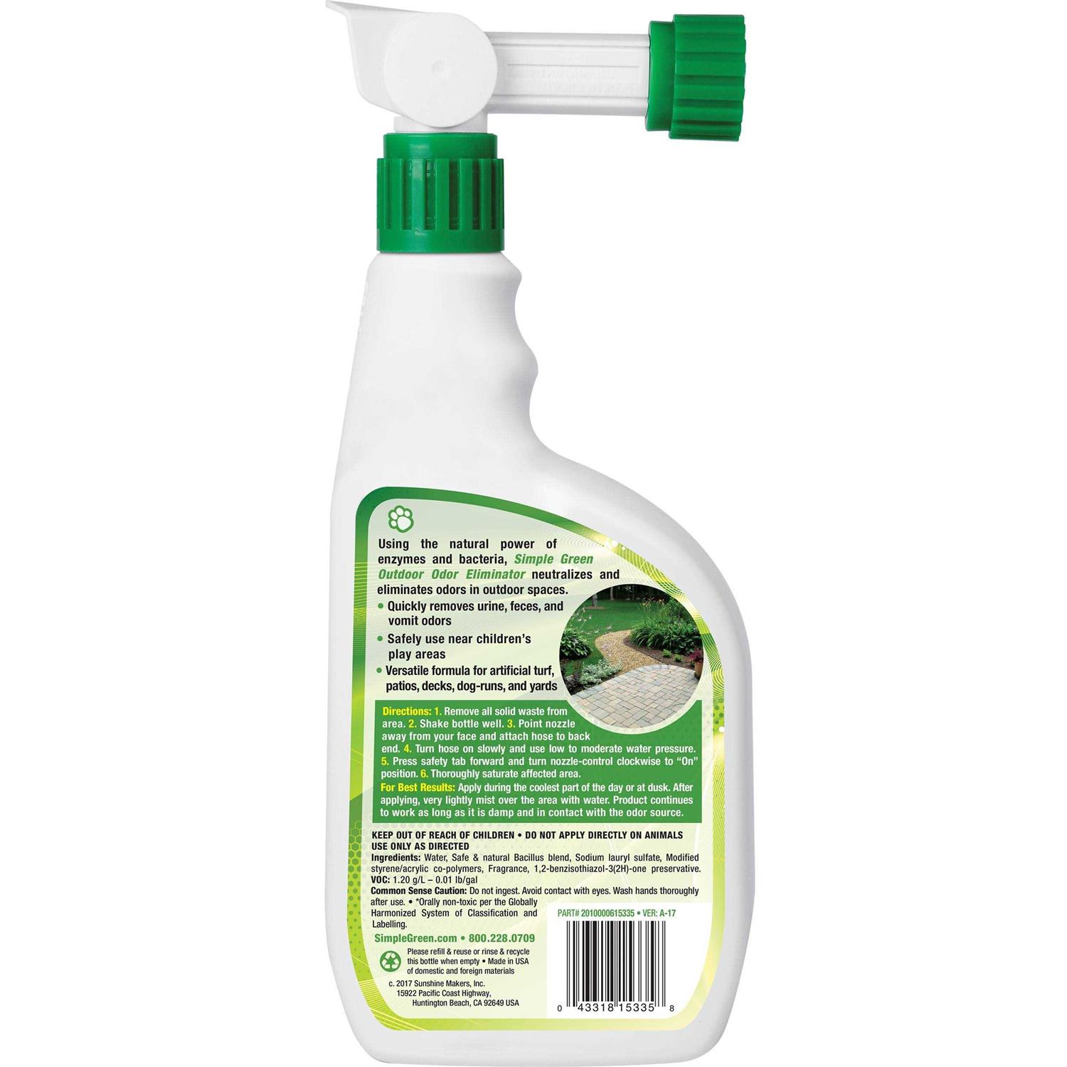 Simple Green Outdoor Odor Eliminator removes nasty smells left behind by animal urine, stool, vomit and other organic matter. This formula uses powerful natural enzymes to eliminate odors at the source, rather than just covering them up. Works great on grass, turf, gravel, concrete, decks, patios, dog runs, kennels, and more. Leaves behind a fresh, clean scent. Bottle features a hose attachment nozzle for easy spray application. Optimized for use around pets. Neutralize pet odors left behind by urine, stool, vomit, and more Use on grass, artificial turf, gravel, concrete, brick, and more Uses powerful natural enzymes to eliminate odors at the source Optimized for use around pets and landscaping Bottle features hose attachment for easy outdoor application Ideal for patios, decks, dog runs, kennels, and yards Leaves behind a fresh, clean scent so your yard smells good again Never tested on animals Simple Green, 32 oz. Outdoor Odor Eliminator, 2000000115335 Quickly remove urine, stool and other odors from decks, patios, dog runs, walkways and yards with this Simple Green Outdoor Odor Eliminator.