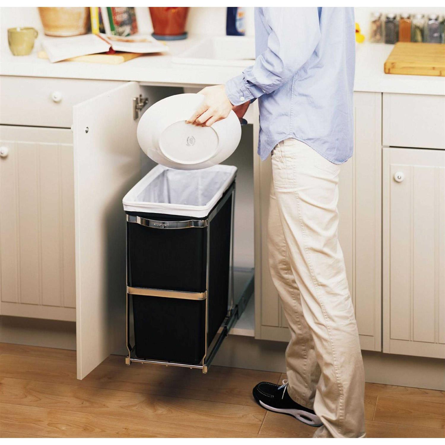 Product details simplehuman Kitchen Pull-out 7.9 gal The durable simplehuman pull-out can holds trash or recyclables while hiding out of sight in the cabinet. It glides in and out smoothly on a commercial-grade track and installs easily. frame has polished chrome finish and convenient pull handle installs easily with only four screws, included use with simplehuman custom fit trash can liners, code K 8-gallon capacity Plastic/metal. Trash can measures 11.5×20.6×23″H. Wipe clean. Assembly required; screwdriver needed. Imported.