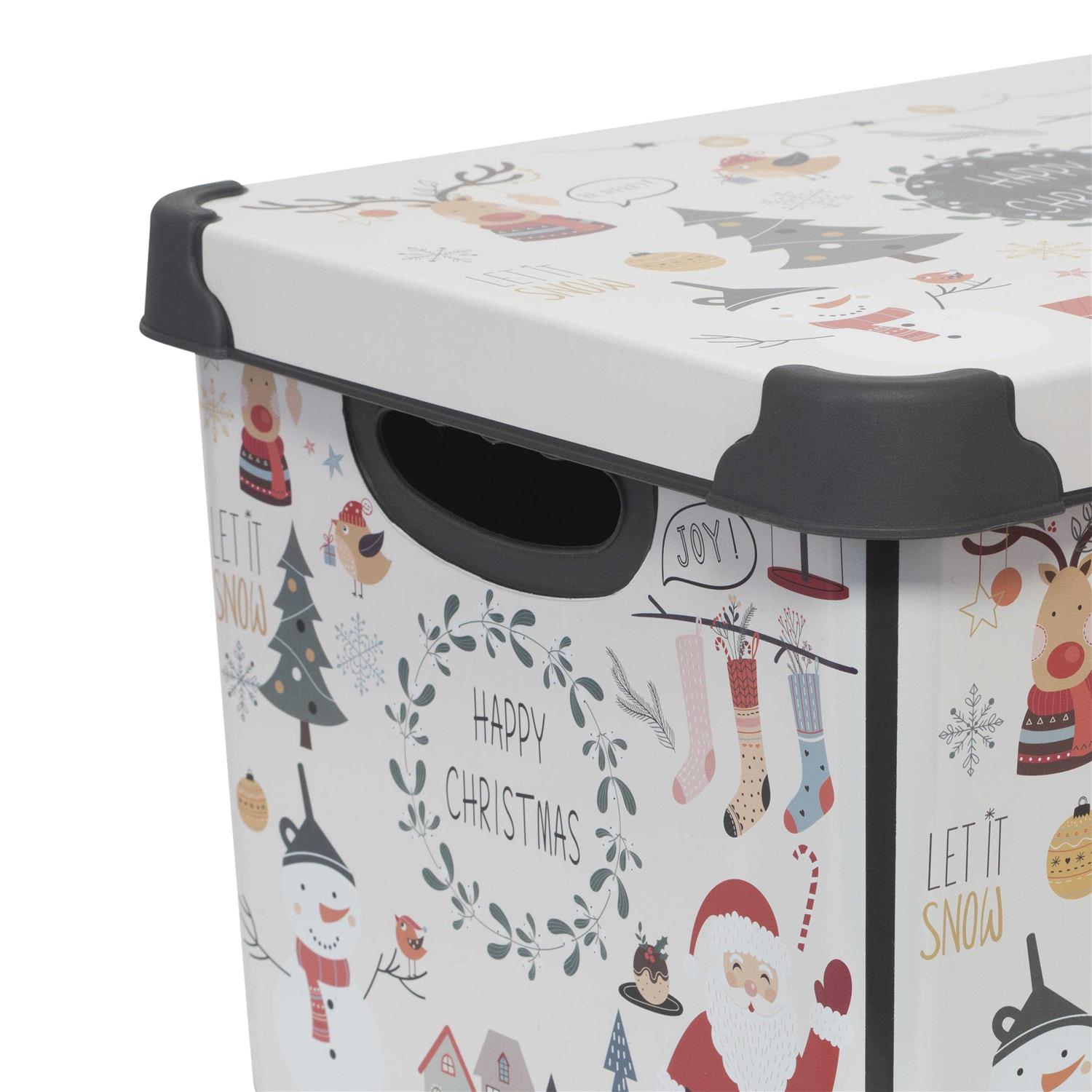 Keep your precious holiday decor safe on the off season with the Simplify Holiday festive storage tote bins! The plastic material allows the storage bin to protect what’s inside from being crushed, dust, odors and water. Stackable design allows you to maximize your storage space, removable lid makes it easy to pack and unpack your items. The festive holiday print allows you to use for more than just a storage box, can be used as a big gift box or a holiday basket!