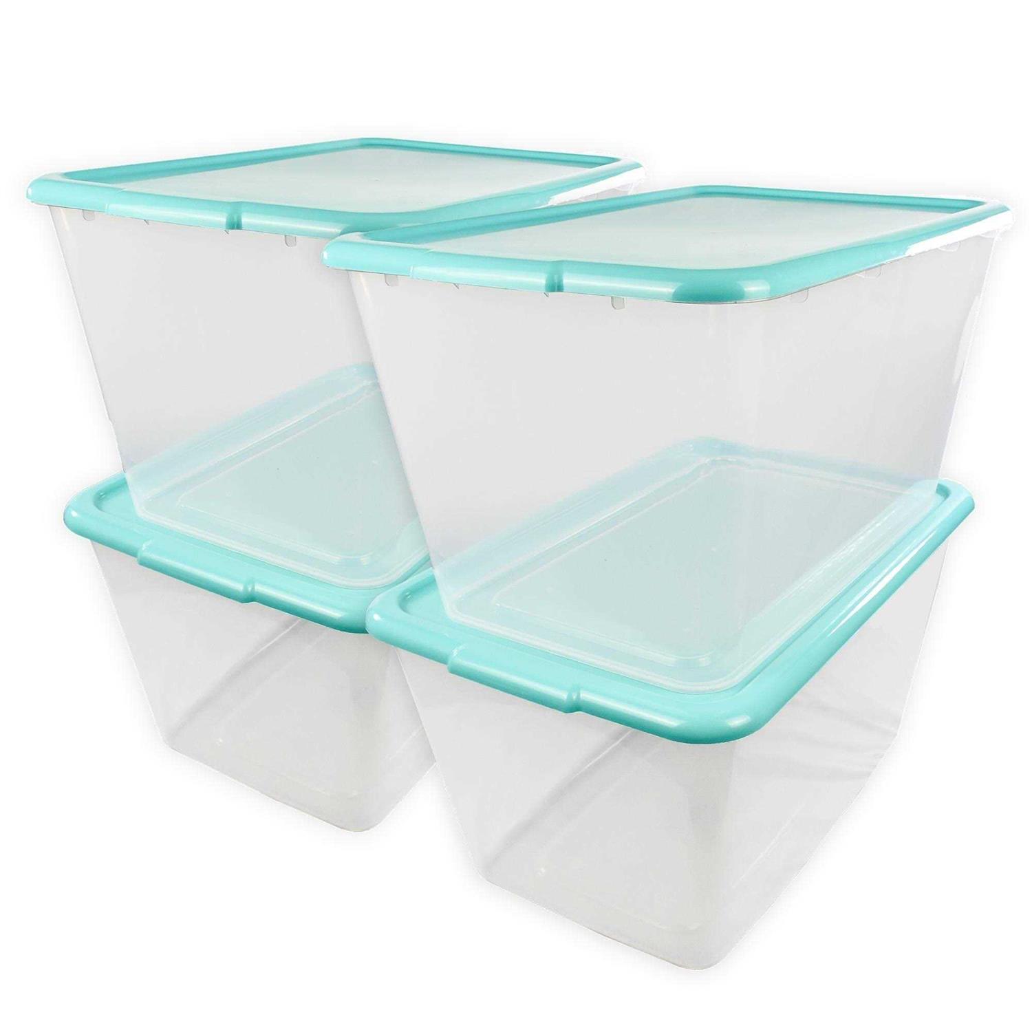 Keep your home organized and clutter-free with the Simply Kleen 14.5-Gallon Plastic Storage Containers. This set of four bins is great for storing holiday decorations, arts and crafts, clothes and shoes, sports equipment, and more. These versatile storage totes can be used in the garage, basement, attic, closet, or in any room where you need additional organization. Their clear design with colorful lids complements the existing decor and allows for color-coordinated storage, while the transparent sides provide visibility into the tote. These space-saving bins can be conveniently stacked with the lids on or nested together when not in use, and the snap-on lids keep items dry, dust-free, and securely stored inside. These reusable storage boxes are made with heavy-duty recyclable polypropylene plastic and manufactured in the USA for long-lasting durability you can count on year after year. Measuring 24” x 16” x 13” each, these stackable containers have a large 14.5-gallon (58-quart) capacity to maximize storage space around the home.
