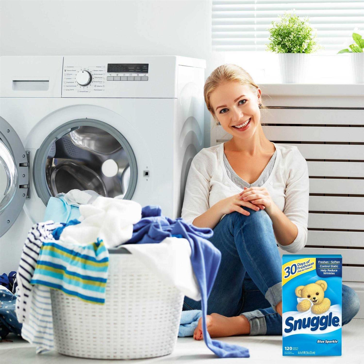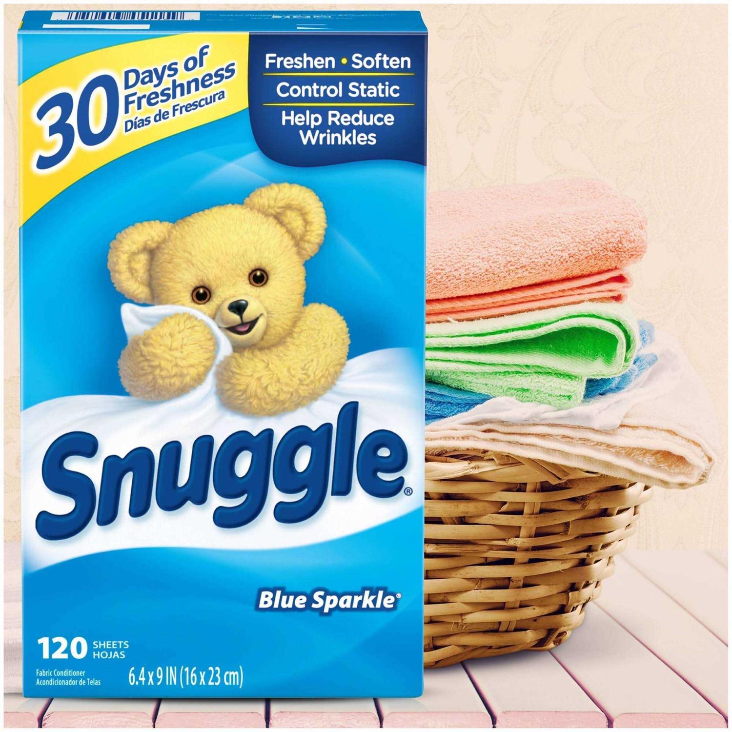 In addition to using in the dryer to make your clothes feel softer, fabric softener sheets can also be used in a variety of places like closets, gym bags, suitcases, and cars to make them smell fresh. For long-lasting freshness and static reduction, add a Snuggle brand dryer sheet to every load you dry. Plthe sheet on top of wet clothes and start the dryer cycle as usual. Discard after use. Safe for standard and HE washing machines. Includes one box of 120 dryer sheets. Features: Snuggles original Blue Sparkle scent is a and clean blend of white floral and bright green citrus notes that snuggle up to warm woody notes and soft musk for a comforting, long-lasting freshness your family will love. In addition to using in the dryer to make your clothes feel softer, fabric softener dryer sheets can also be used in a variety of places like closets, gym bags, suitcases, and cars to make them smell fresh. For long-lasting freshness and static reduction, add a Snuggle brand dryer sheet to every load you dry. Plthe sheet on top of wet clothes and start the dryer cycle as usual. Discard after use. Safe for standard and HE dryers. Includes one box of 120 dryer sheets.