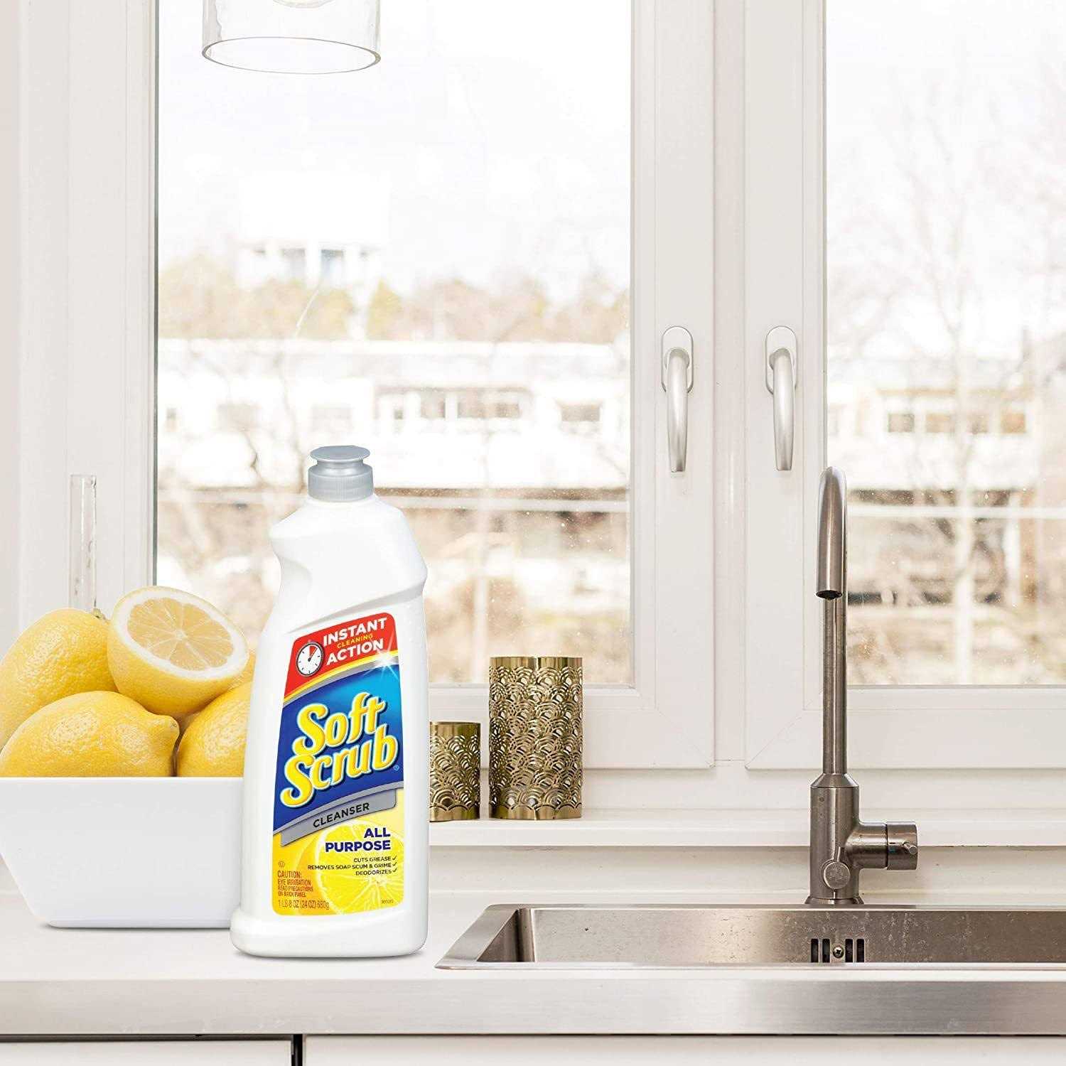 Soft Scrub all purpose cleanser has an improved formula now packs even more cleaning punch in a faster and easier to rinse formula! Its perfect for powerful cleaning on sinks, showers, and toilets and removing tough stains from bathroom and kitchen surfaces. It leaves behind a fresh lemon scent once youre done cleaning. This product is Orthodox Union certified Kosher. Soft Scrub total all purpose bath & kitchen cleanser cleans surfaces in the bathroom, kitchen and throughout the house. It removes soap scum, hard water stains, limescale, grease, grime, and food stains, and is safe to use on stainless steel, chrome, granite, porcelain, ceramic, plastic laminate, and glass-top stoves. This package includes one 24 ounce bottle of Soft Scrub all purpose cleanser in lemon scent.