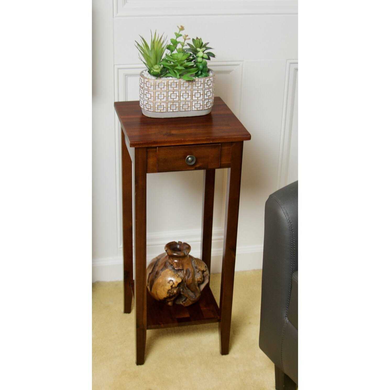 Traditional style meets timeless beauty in this solid acacia wood plant table. Expertly crafted, the frame is reinforced with metal corner brackets adding strength and stability. The drawer features a nylon drawer stopper, keeping the drawer from completely pulling out and second-tier adds storage and display space. A beautiful clear lacquer finish highlights the contrast of the natural wood grain. This piece is small space friendly and supports 80 lbs. Solid acacia construction Simple elegant design Ideal for small spaces Supports up to 80 lbs. Metal brackets for added stability Drawer includes nylon drawer stopper Assembled dimensions, 28″H x 12″W x 12″D Create a distinguished look to your bed ensemble by selecting this Unbranded Solid Acacia Wood Natural Plant Table.