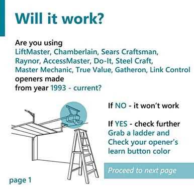 Works for 1993-current Sears Craftsman, LiftMaster, Chamberlain brand openers with Purple, Red/Orange, Yellow, Green smart/learn button on the powerhead (motor unit attached to the garage ceiling – see all photos for clarification) Compatible with opener models 1345, 1355, 1356, 3220, 3240, 3255, 3265, 3266, 3267, 3270, 3280, 3500, 3585, 3595, 3800, 3850, 8165, 8365, 8366, 8367, 8500, 8550W etc (see description for full list) Replacement remote control for Sears Craftsman 139.53753, 139.53681, 139.53879 and LiftMaster 80 series, 970 series, 370 series etc (see description for full list) High quality replacement combo remote, 3-button can control up to three garage door openers, gate operators and/or accessories that features Security+ 315MHz & 390MHz, Billion Code 390MHz, as well as Security+ 2.0 310/315/390MHz highest level encryption rolling code MyQ long range frequencies Easy to follow programming instructions, visor clip and CR2032 lithium battery included for your convenience