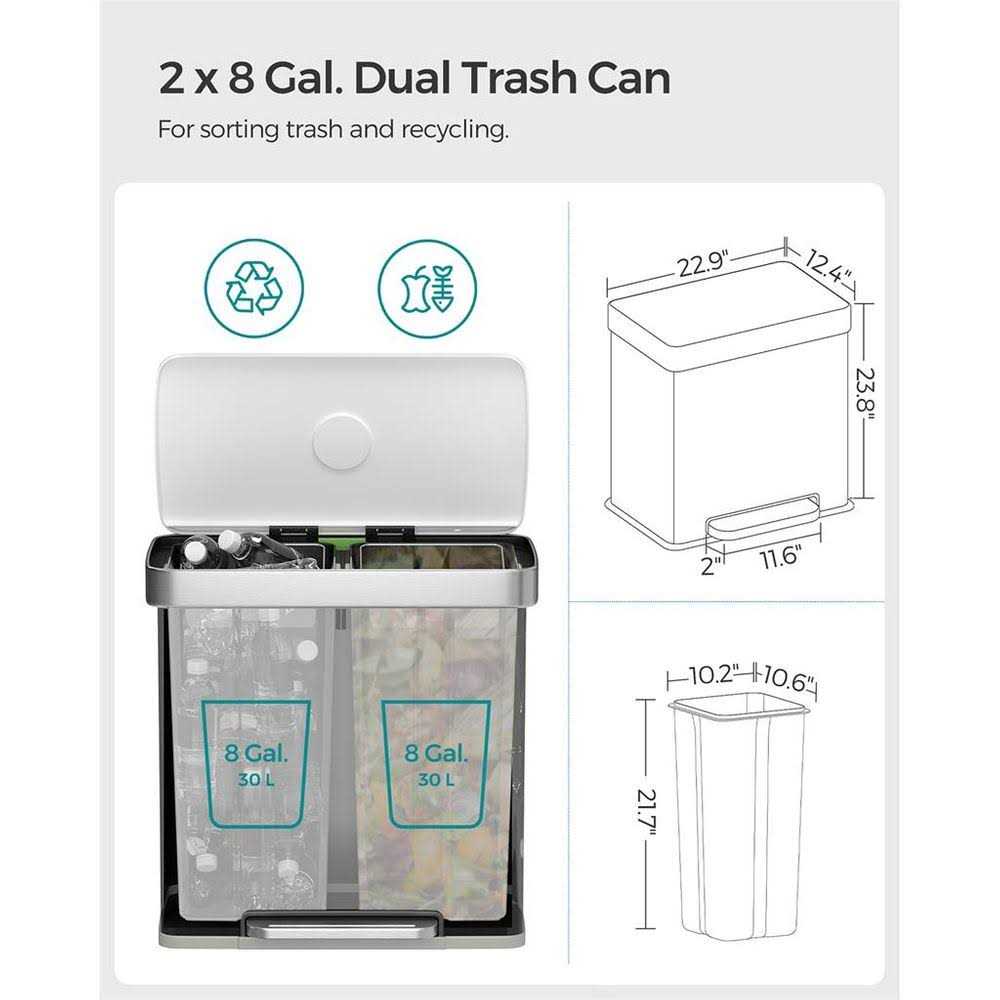 With two 8-gallon compartments, this SONGMICS dual trash can lets you sort all the trash in one spot without taking up too much space. Keep the lid open with the stay-open switch on the lid hinge when you are meal prepping. Step on the wide pedal to open the lid and the lid will close silently and softly after you step away. 2 removable plastic inner buckets with handles in this garbage can make emptying or cleaning much easier. The non-skid pads underneath the base ensure the can stays right where you place it and prevent scratches on the floor. The stainless steel body with powder coating resists rust and fingerprints while the black finish fits perfectly in any kitchen.