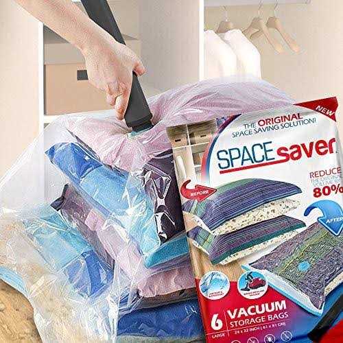 6 x LARGE SIZE BAGS FOR LARGE ITEMS! Store away your clothes, pillows, duvet, extra blanket, mattress, small to medium dresses, and more! 80% more space than other bags on the market! SQUEEZES EVERY BIT OF AIR OUT OF THE BAG! The unique Double-Zip Seal and the Triple-Seal Turbo Valve are designed to get every ounce of air OUT of the bag in the suction process – and nothing gets back in! If you are planning to carry lots of stuff in your suitcase, this is a true space saver vacuum storage bags. INCREASE YOUR STORAGE SPACE BY 80% without having to clean out your closet! Our spacesaver bags are an ideal solution for adding more storage space to your wardrobes, closets, garages, basements, lofts, and suitcases. BEST SPACE SAVER BAG ON THE MARKET! Spacesaver vacuum storage bags are heavy duty, durable, puncture resistant, and reusable! Whether using the vacuum bags for a comforter, blanket, bedding, quilt, mattress topper, pillow, rug, or clothing these vacuum sealer bags will protect over and over! HAND PUMP INCLUDED – Hand pump for travel is included for effortless and quick compression, making the storage process a breeze.