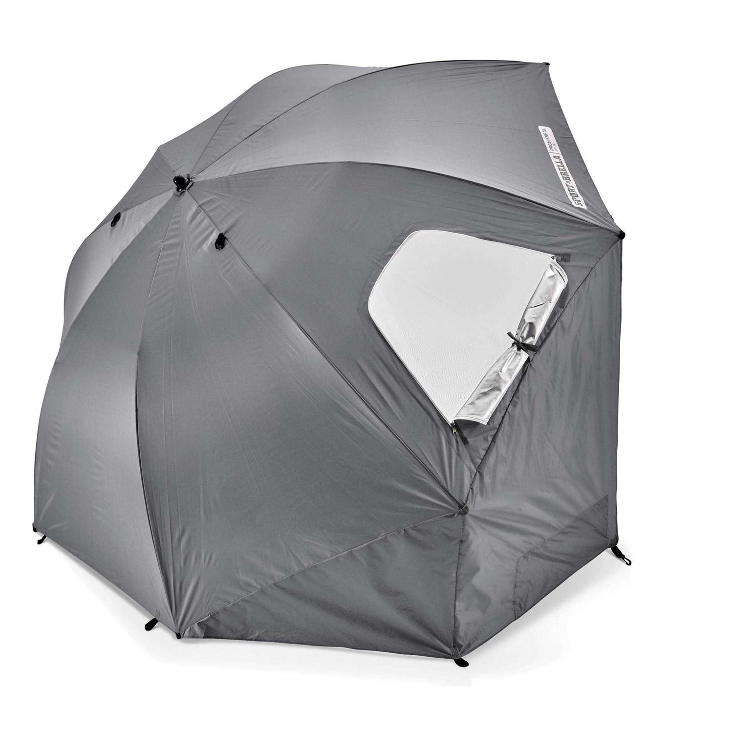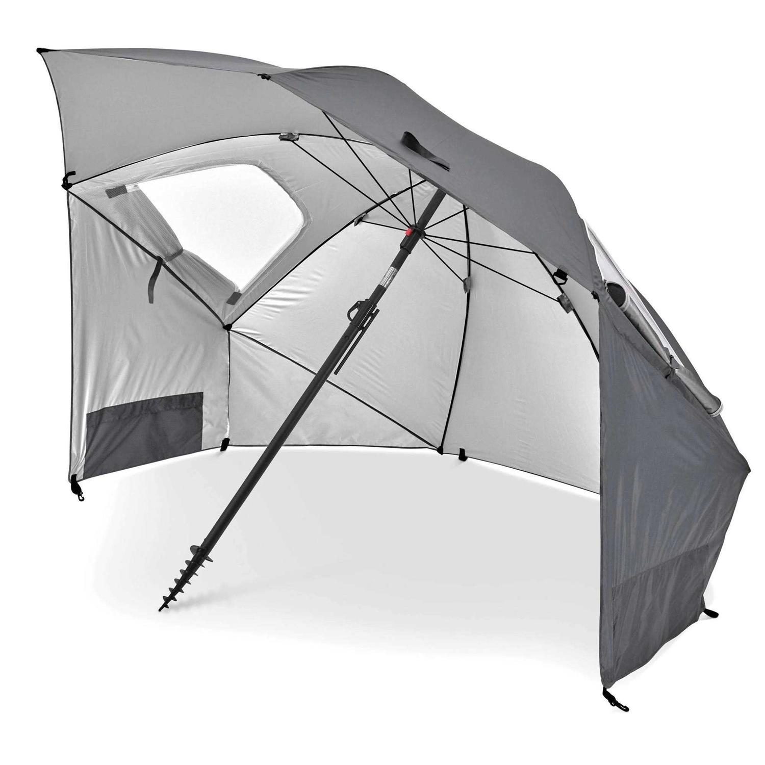 With every feature under the sun and rain, the 8 Sport-Brella Premiere features UPF 50+ sun and weather protection, a heavy-duty 1.25 center pole that pivots, an oversized auger bit with integrated twist handle and patented side panels for increased privacy. Use it at sporting events, concerts, the beach, camping, and even in the backyard. Its zippered windows open to allow in a cooling breeze while helping prevent the umbrella from blowing away. At the same time, the patented side panels include external stow-away clips that allow the flaps to be stored when the umbrellas in the upright position to increase your viewing area. Two reinforced internal pockets are perfect for storing your phone, snacks, and other gear. And when youre ready to pack up, the Sport-Brella Premiere stores easily in a reinforced carry bag that includes stakes for securing it to the ground.