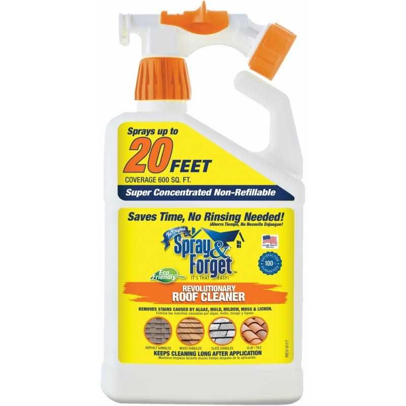 Mildew cleaner hose end sprayer for roofs. Quart sized container. Sprays up to 20 feet bio-blocker and built in sprayer no mixing required economical cleans up to 600 square feet. Removes and prevents moss lichen and algae stains on asphalt shingle metal tile slate and shake roofs. No rinsing required eco-friendly. Safe for pets after drying. Roof stains will disappear within 3 to 6 months with subsequent rainfall. A”No-Rinse” concentrated cleaner that removes and prevents green and black mold mildew algae and moss stains on asphalt shingle tile metal and cedar shake roofs. Contains no harmful bleach lye acid or phosphates.
