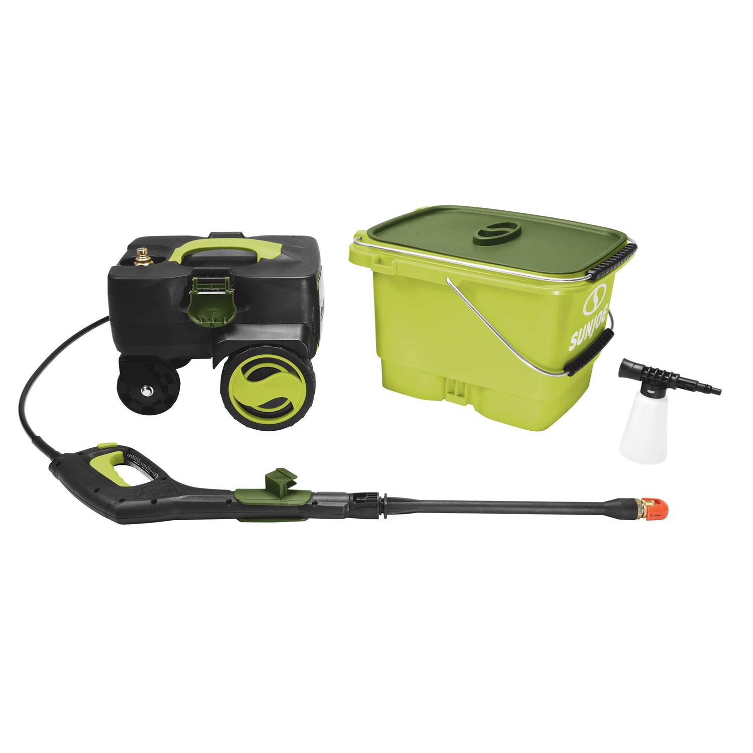 Build Your Bucket List. Get ready to cross a ton of outdoor chores off your home improvement list with the SUN JOE i ON Spx6001C Cordless Pressure Washer. Only i ON gives you the room to roam courtesy of the powerful removable rechargeable 40-Volt i Onmax lithium ion battery to take your cleaning tasks on the road – or anywhere power is at a premium. The Spx6001C cordless pressure washer is perfect for light duty jobs like cleaning the cabin deck boat RV or a host of chores around the house. The innovative top-loading detachable bucket design fills quickly with fresh water or can can be connected for continuous use with a garden hose. The self-priming pump provides superior performance and ease of operation while i ONs exclusive Pressure Select Technology lets you choose the perfect pressure to suit the cleaning task to tackle everything from siding to sidewalks to porch and patio furniture and much more. Simply select from among the four Quick-Connect tips or Soap Sprayer attachment to customize your cleaning results and put the power of i ON to work on your outdoor cleaning projects. Powerful 40V / 600-Watt motor generates up to 1160 PSI / .79 Gpm perfect for light duty cleaning power.