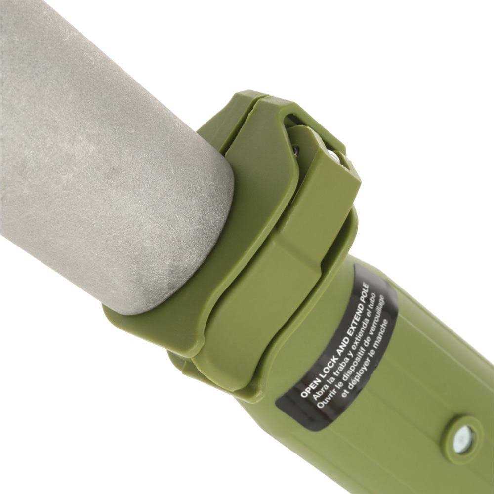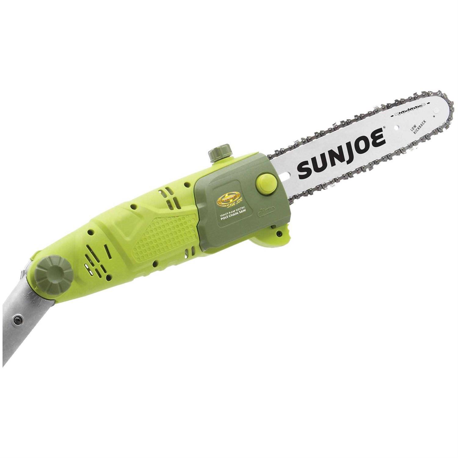 Dimensions: 96.45L x 5.5W x 3.6H in.. Select from available color options. Features 10-in. oregon cutting bar and chain. Up to 7.9 lbs. in weight and includes automatic lubrication. Includes 8-amp motor and cuts branches up to 9.5-in. thick. Features (0 to 30 degrees) adjustable multi-angled head. Provides up to 15-ft. overhead reach with telescoping pole extending 9.4 ft.. Suitable for cutting thin logs and overhanging limbs. CSA approved. Take care of hard-to-reach branches with ease thanks to the Sun Joe SWJ803E Multi-Position Electric Pole Chain Saw. This chainsaw comes with a telescoping pole to extend your reach up to 15 feet and features an multi-angle head that adjusts up to 30-degrees. The 10-in. Oregon cutting bar has a self-lubricating design that never needs maintaining. The electric motor is quiet and powerful, free of offensive odors and smoke. A built-in safety switch helps prevent accidents.